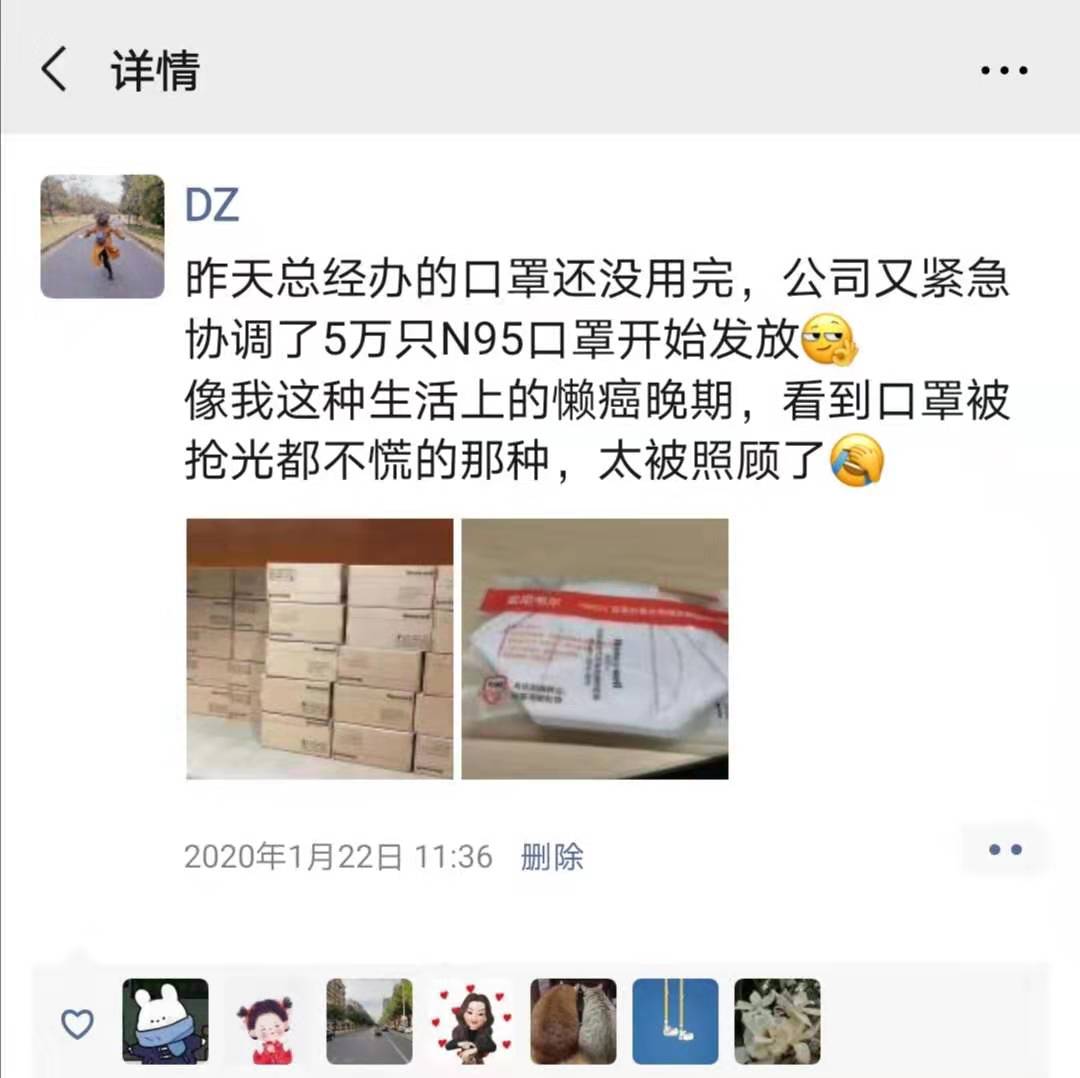 春節(jié)放假前夕,疫情形勢(shì)陡然嚴(yán)峻。在蘇寧南京總部工作的小丁清楚地記得,1月2 2 日那天,她在上班的路上,看到戴口罩的人多了起來(lái),還和小伙伴念叨著也要趕緊買些。結(jié)果,當(dāng)天上午,部門就給每人發(fā)了一個(gè)全新的N9 5 口罩,讓她倍感驚喜和暖心。原來(lái),蘇寧總部緊急調(diào)集了5萬(wàn)個(gè)口罩發(fā)到員工手中,各大區(qū)也紛紛緊急調(diào)貨給員工發(fā)放。自稱“懶癌晚期”、平時(shí)連朋友圈都很少發(fā)的她,忍不住發(fā)圈為公司點(diǎn)贊。