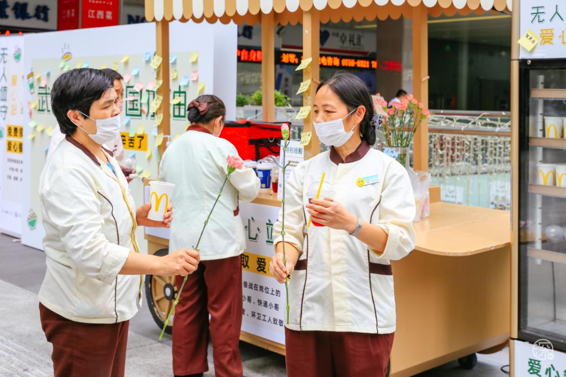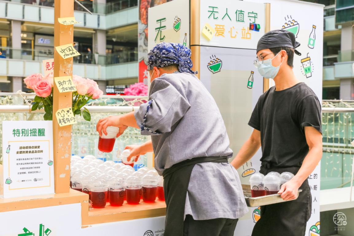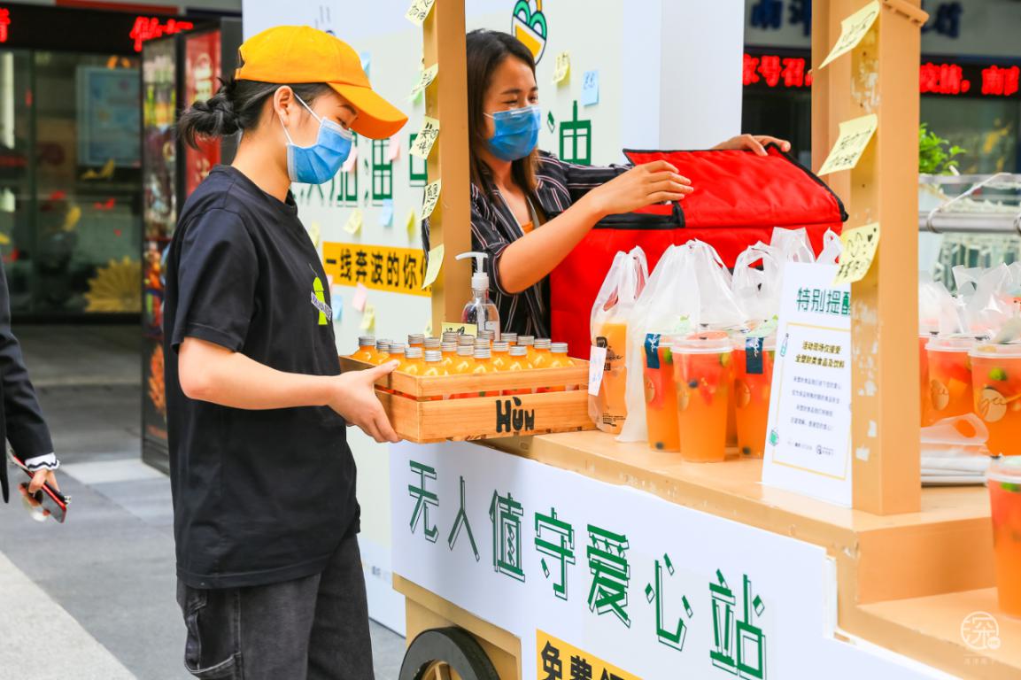 3月3日至3月8日卓悅INTOWN在街頭專設(shè)了一個(gè)”無人值守愛心站”,用愛心餐車上放滿了食物冷/熱飲,專門免費(fèi)贈(zèng)送給快遞、外賣小哥、環(huán)衛(wèi)工人、警察、城管等一線奔波的人員。