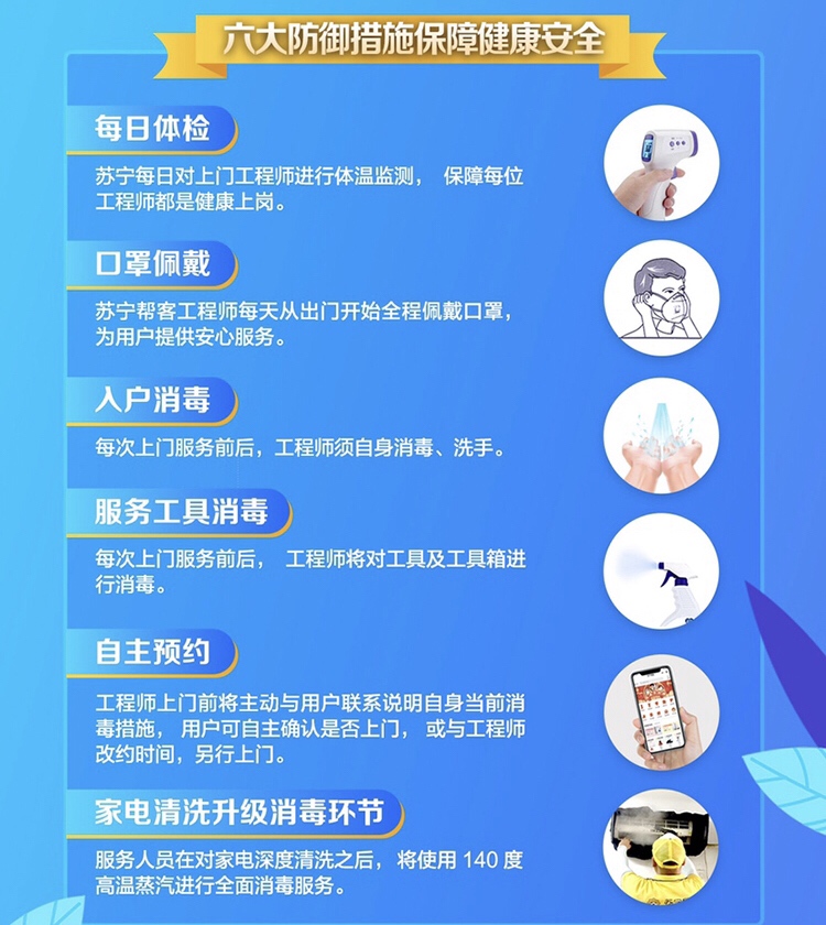 據(jù)了解,該承諾卡是蘇寧創(chuàng)建,主要承諾內容包括服務前的體溫檢測、工具消毒、個人防護;服務中的工程師全防護、工具不落地、與用戶保持安全距離;服務后的機器清潔、線上保修減少上門以及清理服務現(xiàn)場。