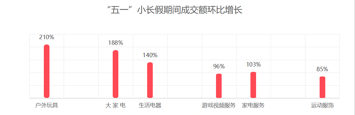 “五一”小長假期間,國產(chǎn)商品的成交額同比增長了52%。國產(chǎn)的生鮮產(chǎn)品十分豐富,農(nóng)產(chǎn)品觸網(wǎng)利用信息經(jīng)濟(jì)快速的將地方市場轉(zhuǎn)化為全國市場,成交額同比增長了148%。此外,國產(chǎn)的家電、農(nóng)資園藝、清潔用品及廚具的成交額同比增長較高。
