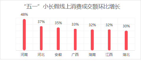 “五一”小長假尤其對河南、河北、安徽等中部省份的線上消費(fèi)拉動作用更強(qiáng)。由于一線城市的線上消費(fèi)趨于日常化,人們多外出活動,用親近大自然、戶外活動的方式度過假日。同時(shí),一部分在大城市里工作的人員也在假日返回老家,帶動了中部省份的線上消費(fèi)。