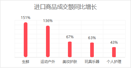 隨著人們生活水平的提升,進(jìn)口生鮮成交額同比增長了151%。近幾年,進(jìn)口生鮮的價(jià)格門檻下降,尤其是進(jìn)口的奶制品、豬肉、牛肉的價(jià)格跟國產(chǎn)商品十分接近。此外,借助于品牌優(yōu)勢,進(jìn)口的運(yùn)動戶外、美妝護(hù)膚、玩具樂器、個(gè)人護(hù)理等商品的成交額同比增長也比較高。