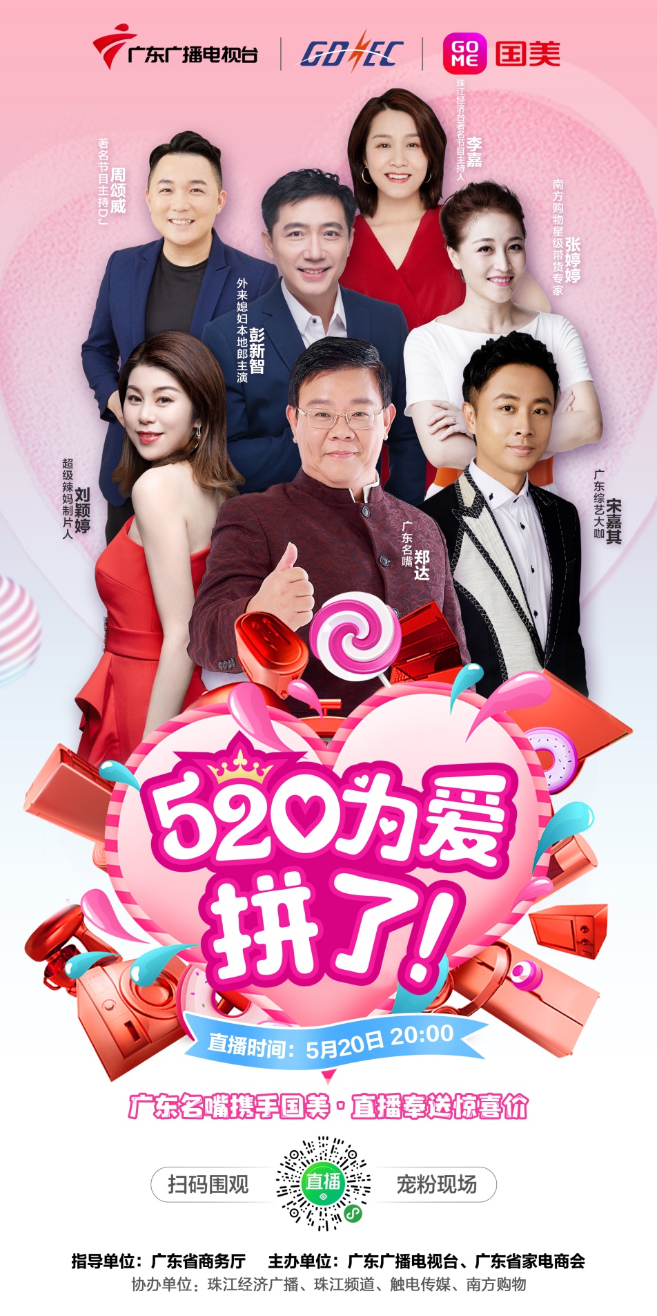 見(jiàn)圳客戶端·深圳新聞網(wǎng)2020年5月15日訊 在廣東省商務(wù)廳指導(dǎo)下,由廣東廣播電視臺(tái)、廣東省家電商會(huì)和華南國(guó)美聯(lián)合舉辦,“520為愛(ài)拼了”超級(jí)直播將于5月20日晚8點(diǎn)整驚喜開(kāi)播!廣東名嘴鄭達(dá)、綜藝大咖宋嘉其、影視演員彭新智攜一眾明星主播為廣東省的街坊們帶來(lái)空調(diào)、冰箱、洗衣機(jī)、電視、手機(jī)等大批家電潮品!屆時(shí),主播們不僅給街坊們帶來(lái)意想不到的低價(jià),直播中還會(huì)不間斷抽出手機(jī)、家電等大批豪禮,敬請(qǐng)期待!這次直播是全國(guó)首次大小屏同步直播,街坊們不僅可以通過(guò)美店商城、看點(diǎn)直播、京東、珠江頻道直播小程序、珠江經(jīng)濟(jì)廣播呼啦直播小程序、南方購(gòu)物直播小程序、觸電新聞APP等平臺(tái)在線觀看并下單,而且還可以打開(kāi)南方購(gòu)物電視頻道下單購(gòu)買(mǎi)。