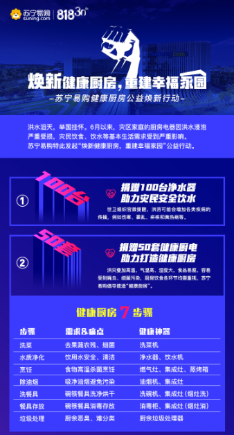 與此同時(shí),洪水致使大批廚房電器受損,疊加高溫天氣,災(zāi)民飲食安全面臨考驗(yàn)。蘇寧易購特別捐贈50套健康廚電,涵蓋油煙機(jī)、灶具、消毒柜等必備廚房電器,讓災(zāi)民更快恢復(fù)健康生活。同時(shí),廚房作為“病從口入”最關(guān)鍵的環(huán)節(jié),洗菜、水質(zhì)凈化、烹飪除油煙、餐具清潔消毒、廚余垃圾處理等每一環(huán)都不容忽視,蘇寧易購特別倡導(dǎo)“健康廚房7步驟”,全流程打造健康廚房,并借助蘇寧易購雙線渠道全面開展科普活動。