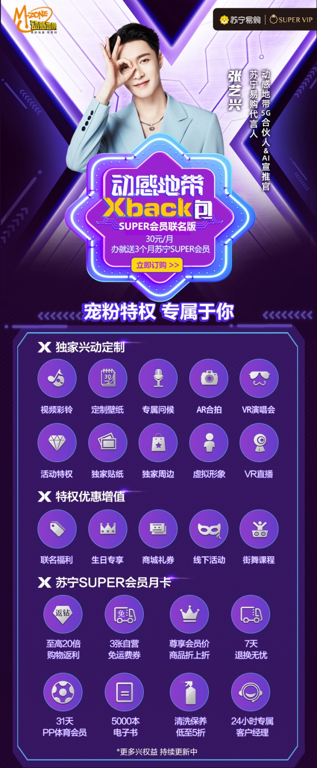 618期間張藝興成為蘇寧易購代言人,7月21日中國移動官宣張藝興為動感地帶5G合伙人&AI宣推官。SUPER聯(lián)名版動感地帶Xback包在818期間推出,讓蘇寧易購和中國移動的跨界營銷合作浮出水面,外界也更好奇,818之后,蘇寧易購和中國移動是否還會有更大的動作。