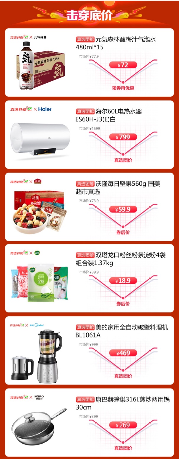 參與真選萬人團(tuán)的產(chǎn)品,大家電如海爾電熱水器,市場價(jià)1599元,真選團(tuán)購價(jià)低至799元;美的滾筒洗衣機(jī),市場價(jià)3599元,真選團(tuán)購價(jià)2499元……優(yōu)惠力度非常之大,部分產(chǎn)品優(yōu)惠可超千元。