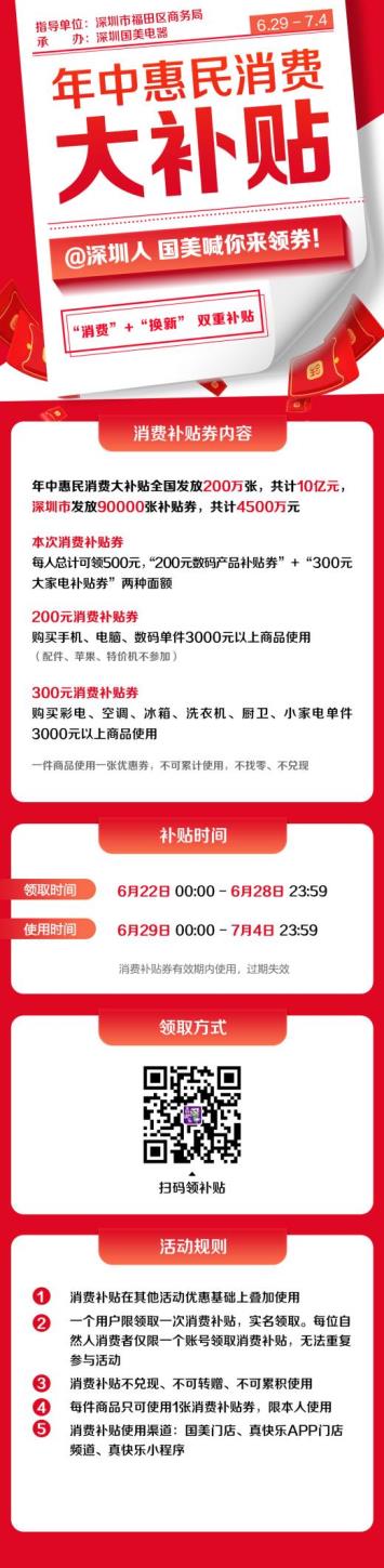 據(jù)了解,本次活動的發(fā)券時(shí)間為6月21日至6月28日,用券時(shí)間為6月29日至7月4日。全國消費(fèi)者只需登錄國美線上平臺“真快樂”,找到“門店”頻道(一店一頁),進(jìn)入“年中消費(fèi)惠民大補(bǔ)貼”活動輪播頁面,點(diǎn)擊進(jìn)入活動詳情頁即可領(lǐng)取補(bǔ)貼券。這次補(bǔ)貼將惠及全國總計(jì)約200萬人,數(shù)量有限,實(shí)名專享,廣大消費(fèi)者想要薅羊毛一定要趁早!