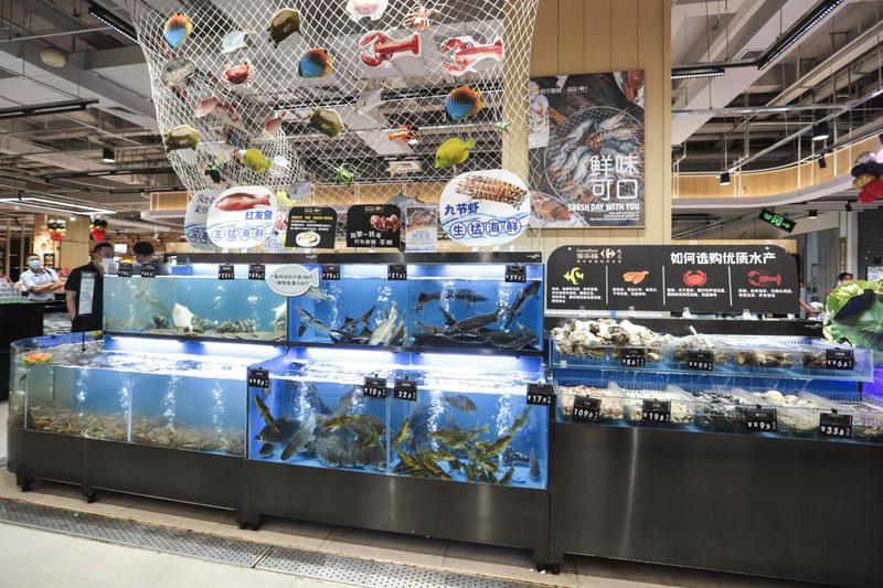 暢游的鱘魚、張牙舞爪的小龍蝦、不斷彈尾的波士頓龍蝦,生猛異常。據(jù)悉,鮮活水產(chǎn)的進(jìn)駐家樂福密謀已久。過往超市水產(chǎn)區(qū)域品類以淡水活魚與冰鮮產(chǎn)品為主,鮮活海鮮十分罕見。今年5月,家樂福與國內(nèi)龍頭合作,將來自全國各大產(chǎn)地的鮮活水產(chǎn)品,經(jīng)過抽查、驗(yàn)收、分揀等工序,每天到店,成為首家規(guī)?;瘑吁r活海鮮自營的雙線零售商超。