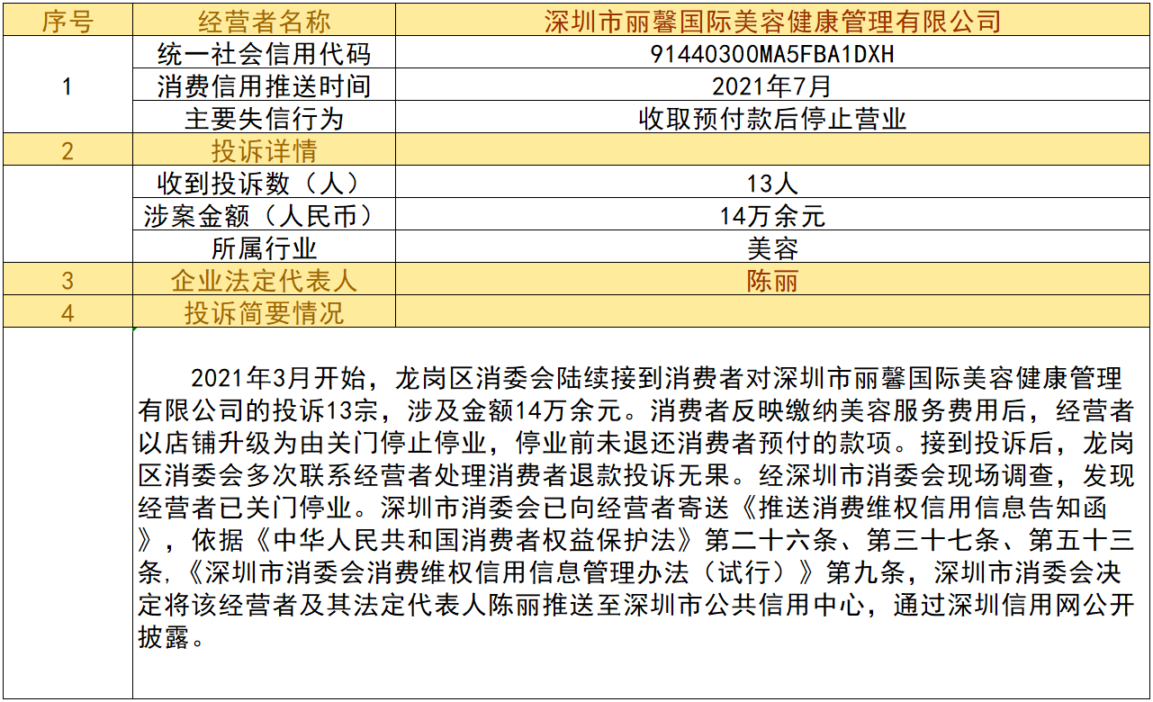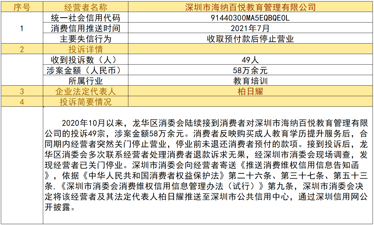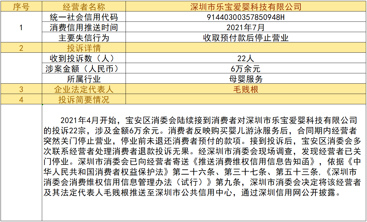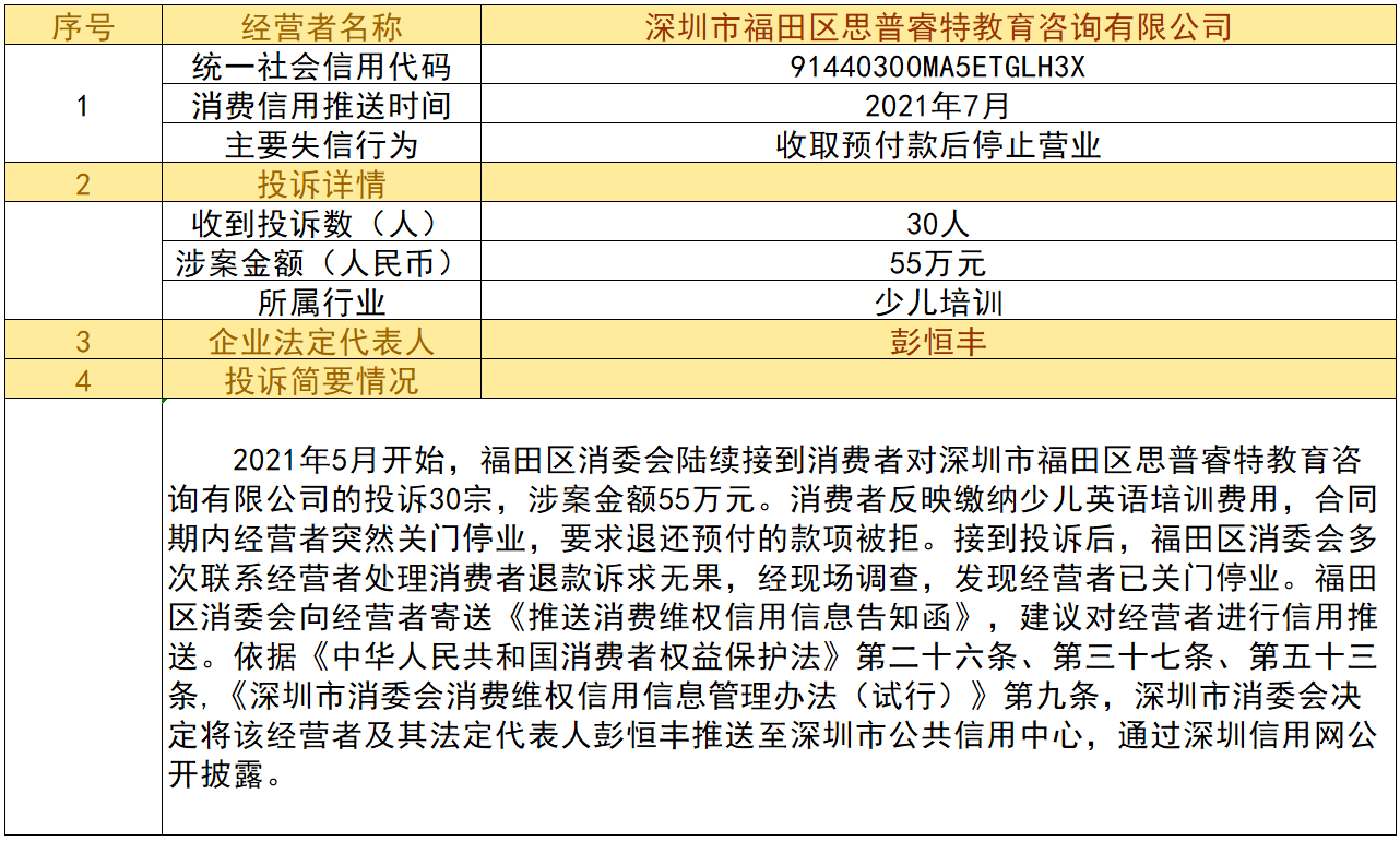 近日,深圳市消委會將九家“跑路”、未按約定退還消費者預付款項的經營者及其主要負責人推送至深圳市公共信用中心,失信經營者信息信息將通過深圳信用網公開披露。
