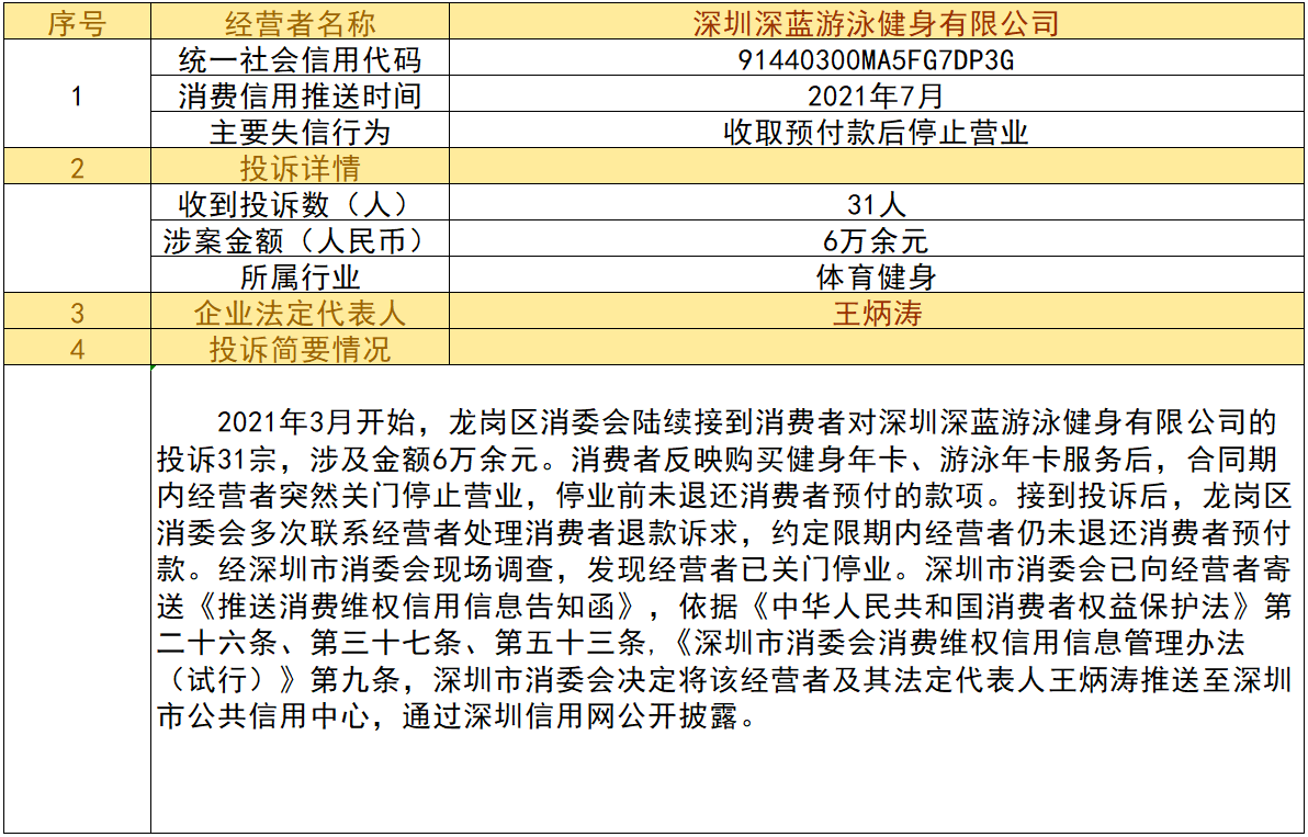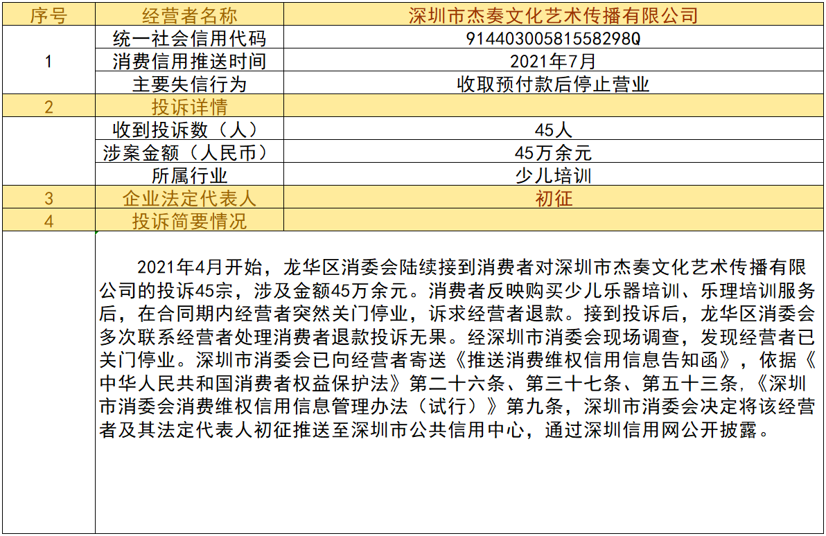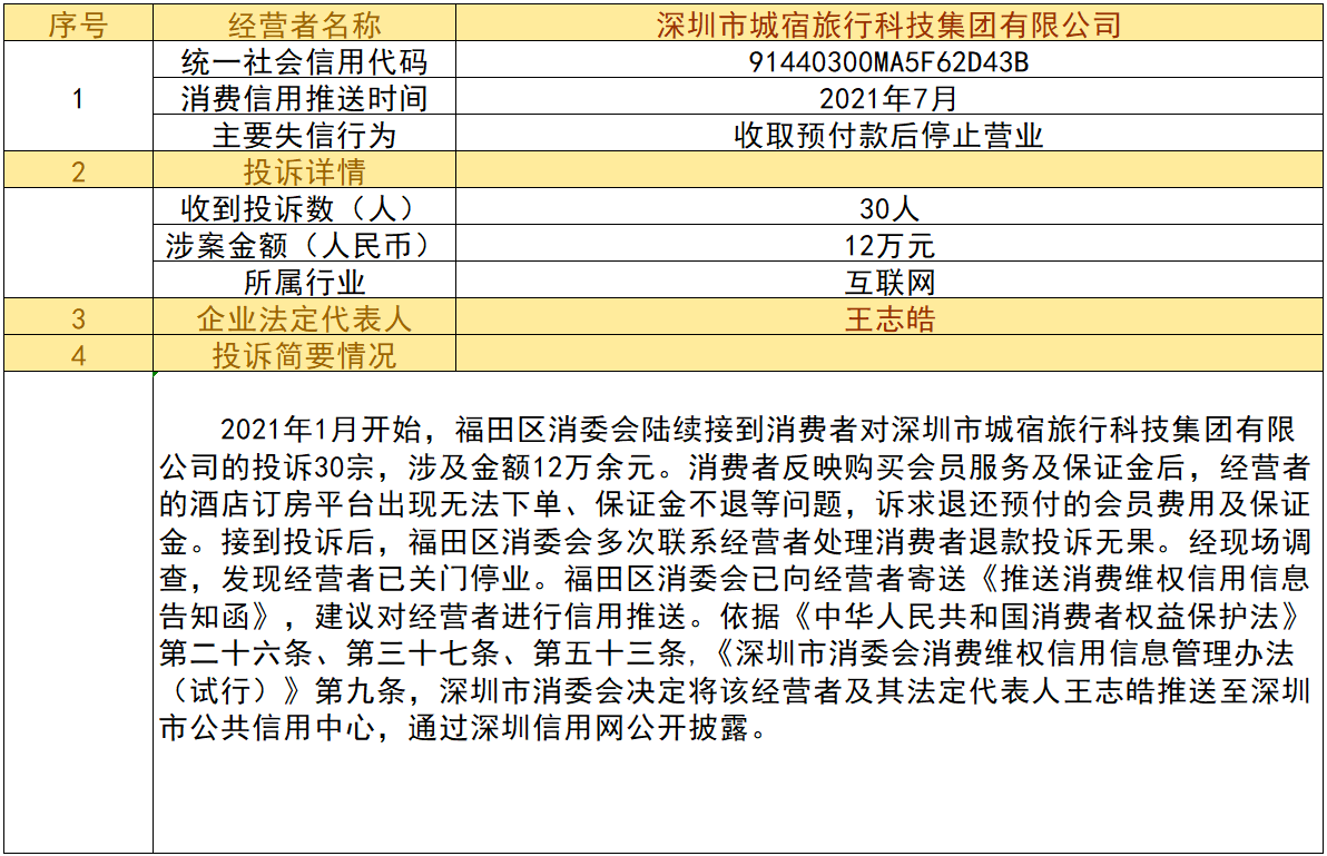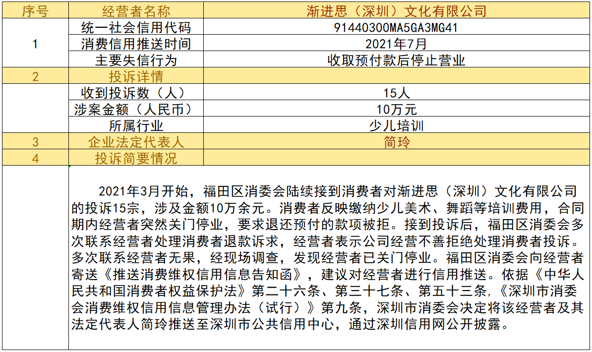 近日,深圳市消委會將九家“跑路”、未按約定退還消費者預付款項的經營者及其主要負責人推送至深圳市公共信用中心,失信經營者信息信息將通過深圳信用網公開披露。