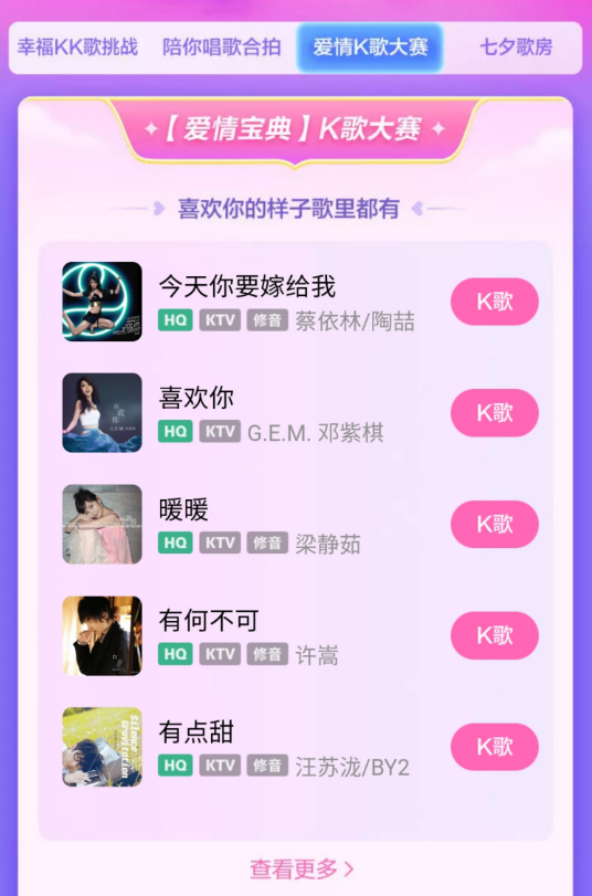 此次活動的主題曲《幸福KK歌》改編自著名歌謠《幸福拍手歌》,喜歡手勢舞蹈的朋友可以嘗試“幸福KK歌”親密挑戰(zhàn),只要按照示例視頻演唱歌曲并完成5個指定動作,發(fā)布視頻即挑戰(zhàn)成功;而對于喜歡對唱的人,可以選擇“陪你唱歌”心動合拍大賽,在合唱模板中,pick讓你心動的小哥哥/小姐姐,發(fā)布與TA的合唱即算挑戰(zhàn)成功;“情歌王”們則可以來「愛情寶典」K歌大賽一展歌喉,演唱官方七夕主題歌單中的歌曲,人氣排名前10的優(yōu)秀用戶也能獲得獎勵;還有七夕歌房任務(wù)限時開啟,完成七夕歌單演唱、“一起聽”情歌、七夕“話題熱聊”任務(wù),即可獲得“七夕大聲愛”“加油鴨”等道具禮物。