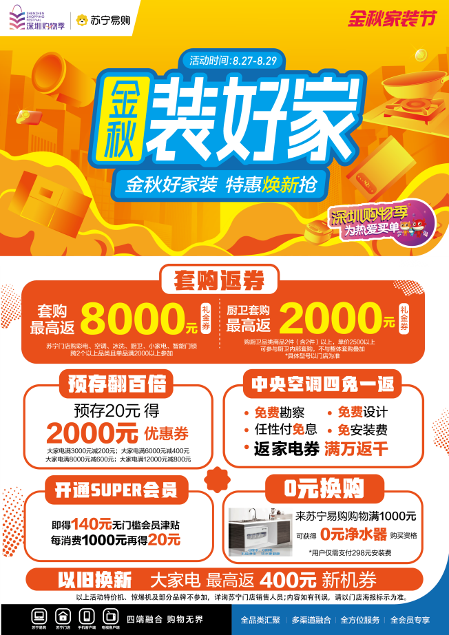 而9月9日到9月12日期間,蘇寧易購將開啟涉及全品類的金秋家裝節(jié),并且將會聯(lián)合海信一起開啟909嗨購盛典,屆時不僅會有大牌匯聚,福利補貼,還將會有家裝品牌共同加入,聯(lián)手提供一站式裝修解決方案,一同為消費者避開家裝過程中的那些坑。同時深圳購物季也在持續(xù)進行中,蘇寧易購作為指定電商平臺,為深圳市提供了一億元的消費補貼,消費者在深圳市蘇寧易購門店參與以舊換新活動,大家電產(chǎn)品最高可以補貼400元,手機產(chǎn)品最高可以補貼1600元,電腦產(chǎn)品最高享受88折優(yōu)惠。另外蘇寧易購還開設了“圳品專區(qū)”,里面匯聚深圳本土大牌產(chǎn)品,折扣低至五折起。