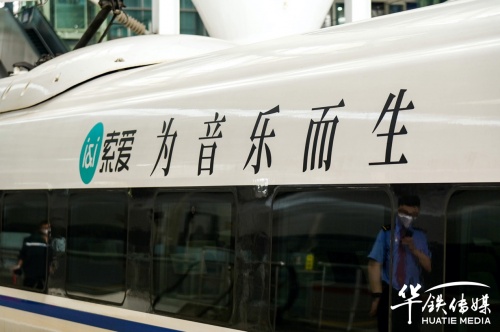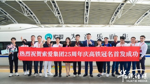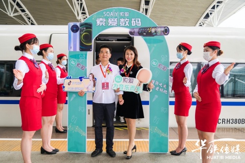 10月28日上午,索愛集團(tuán)董事長劉建佳、總經(jīng)理全雪梅、華鐵傳媒集團(tuán)廣州分公司銷售總經(jīng)理劉延群等領(lǐng)導(dǎo)嘉賓共同為冠名發(fā)車儀式揭幕、剪彩、互贈紀(jì)念禮品,在現(xiàn)場嘉賓的共同見證下,張貼索愛全新品牌代言人陳小春夫婦形象宣傳海報的“索愛-為音樂而生”高鐵冠名列車正式啟程。