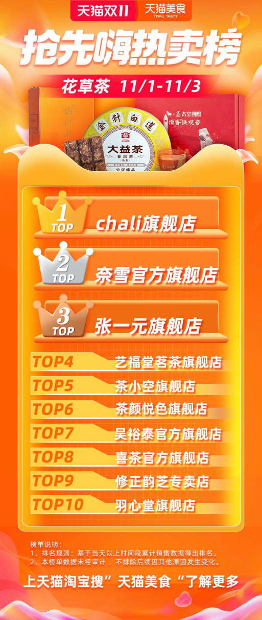 今年“雙11”電商購物節(jié)比往年更早開啟,10月20日晚8點便拉開序幕,奈雪的茶隨之推出滿減、秒殺等多項優(yōu)惠活動。奈雪此次雙11迎來開門紅,數據顯示,11月1日凌晨開售后僅10分鐘,奈雪的茶的銷售總額便突破去年全天。11月1日-3日,伴隨著茶禮盒等產品的熱銷,奈雪躋身花草茶銷售額排行榜TOP2。