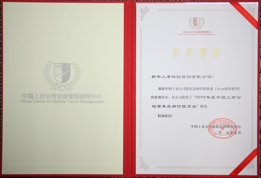 2015年5月,中國(guó)上市公司市值管理研究中心發(fā)布的”2015年度中國(guó)上市公司資本品牌價(jià)值百?gòu)?qiáng)“中,新華保險(xiǎn)赫然上榜!