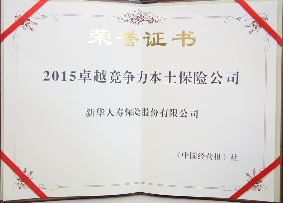 2015年12月,在由中國經營報主辦的2015年度(第七屆)卓越競爭力金融機構評選中,新華保險獲得“2015卓越競爭力本土保險公司”獎。