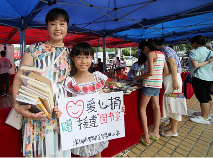 深圳市錦田小學(xué)的部分學(xué)生家長組團從羅湖趕至活動現(xiàn)場,他們帶來了200余本書,剛一擺出來,展區(qū)前就圍滿了人?!霸诹私獾竭@次愛心捐書活動,我們特意從學(xué)生捐獻的書籍中精心挑選出200余本帶到現(xiàn)場。捐書活動與我們的教學(xué)理念很契合,我們愿意讓孩子積極參與,在他們幼小的心靈播下愛的種子,在成長的道路上時刻不忘幫助他人?!卞\田小學(xué)劉向陽副校長告訴記者。