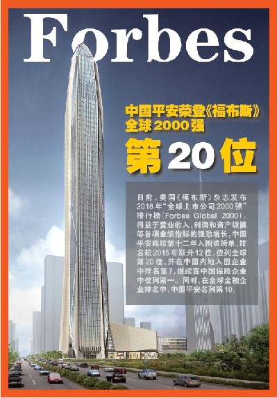 中國平安保險(集團(tuán))股份有限公司連續(xù)第十二年入圍全球上市公司2000強(qiáng),排名較2015年躍升12位,位列全球第20位。
