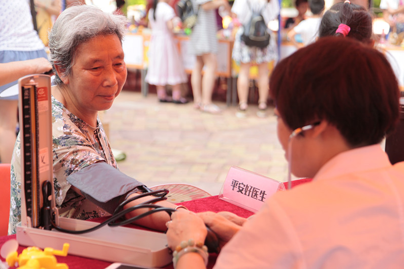 義診現(xiàn)場,居民們排隊(duì)等候醫(yī)護(hù)人員幫他們做檢查。“前兩天,看到海報(bào)上說今天的活動有義診,這不,剛帶孫子游泳回來就過來了。”居民劉奶奶從包里拿出了一個裝藥品的塑料袋,告訴記者,自己高血壓,想讓醫(yī)生瞧瞧那些藥還要不要吃。