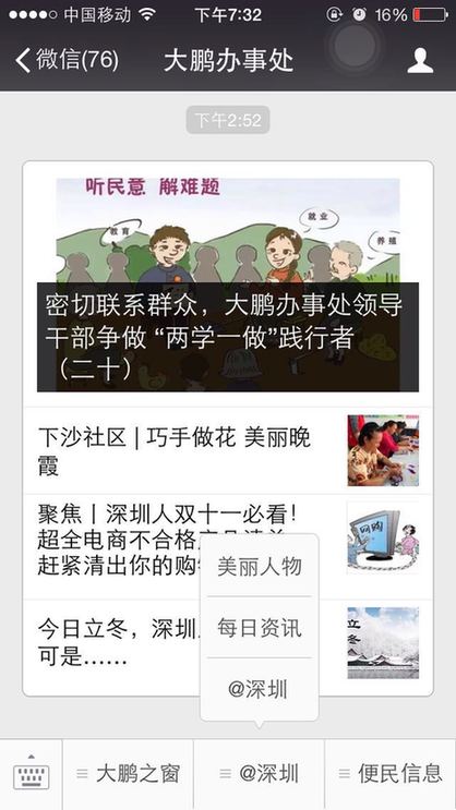 截止到11月7日,大鵬新區(qū)已有大鵬先鋒、大鵬新區(qū)社區(qū)家園網(wǎng)、大鵬公共事業(yè)、筑夢大鵬、、大鵬辦事處等多家政府官方微信公眾號入駐了@深圳。