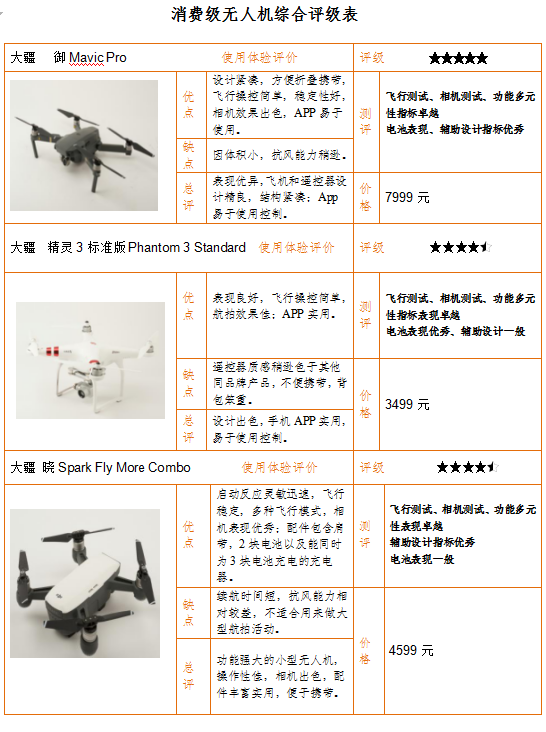 (一)綜合表現(xiàn)最佳。大疆的三款產(chǎn)品綜合評分均高于其他品牌產(chǎn)品,其中“御Mavic Pro”是唯一一個(gè)獲得五星等級評價(jià)產(chǎn)品。