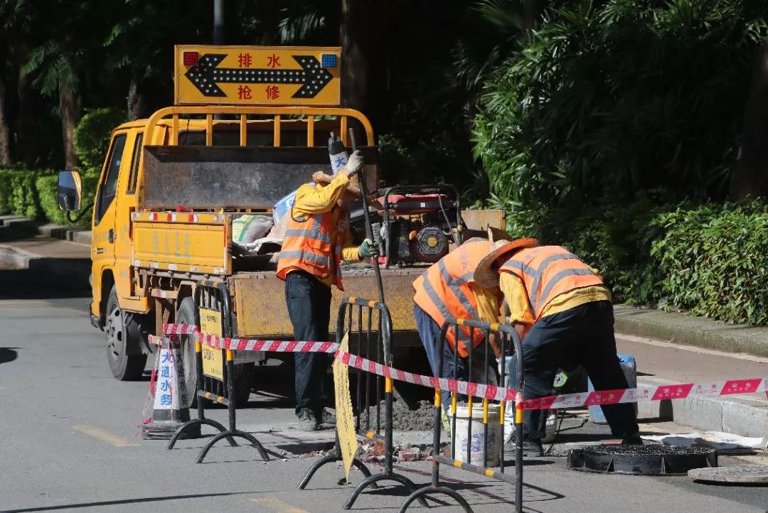 水務部門工作人員在瀾景路上對路面的破損井蓋進行更換。