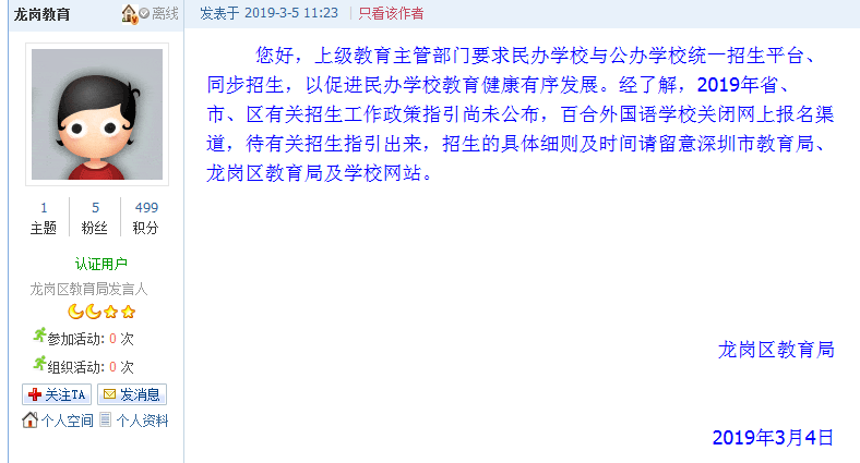 3月3日,有網(wǎng)友“清熱解毒”在深圳論壇以《不到24小時(shí),百合外國(guó)語(yǔ)學(xué)校網(wǎng)上報(bào)名,為何突然關(guān)閉...》為題發(fā)帖反映,“3月1日(周五)深圳眾多小學(xué)6年級(jí)家長(zhǎng)都收到了通知,百合外國(guó)語(yǔ)學(xué)校的信息填報(bào)時(shí)間為3月2日到3月5日?!啊捌届o的周末被百外半夜的一則公告打亂了,家長(zhǎng)們更是被突如其來(lái)的新生登記急蒙了”。