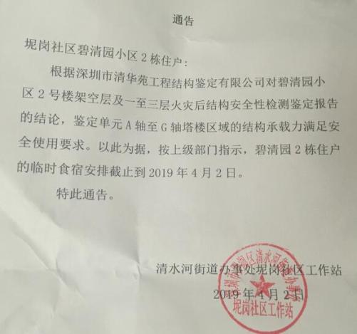 據(jù)記者從坭崗社區(qū)工作站公告了解到,經(jīng)專(zhuān)業(yè)鑒定樓房結(jié)構(gòu)承載力滿(mǎn)足安全使用要求,因此,碧清園2棟住戶(hù)的臨時(shí)食宿安排截止到4月2日。對(duì)于居民提出的室內(nèi)燒焦氣味的安全問(wèn)題,通告內(nèi)容未作出解釋。