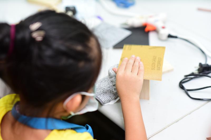 對于“小小木匠”來說,安安靜靜的坐下來,發(fā)揮想象力,傾心打造屬于自己的木質(zhì)音樂盒,無疑是最開心的時刻。聽完老師的講解后,小朋友們迅速進入角色,他們拿著原料木材,一個個化身“小魯班”,用尺子“計較長短”,為它們“改頭換面”起來?;顒蝇F(xiàn)場,一位小朋友正拿著砂紙,小心翼翼的打磨木料,再問及他打磨的工序時,小朋友頗具匠心的告誡記者:“先要用這種粗一點的砂紙打磨,再用這個細(xì)的,這樣打磨出來的音樂盒表面就特別光滑啦……”