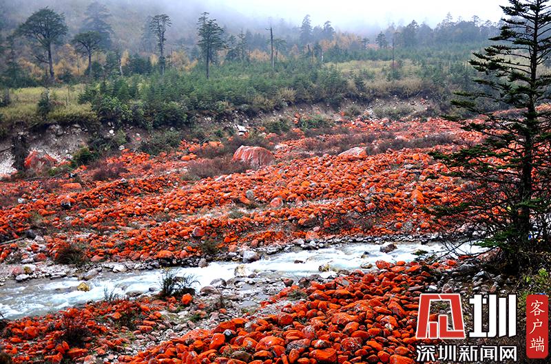 紅石對生長環(huán)境的要求極為苛刻,空氣潔凈度、濕度、水的清潔度都會影響它們的生長。雅家梗一代低碳富氧的空氣、冰山融雪的溪流、森林茂密的植被,為紅石的生長繁衍提供了最理想的環(huán)境。在這里,紅石密布于近百米寬的河谷里,不同的季節(jié),不同的天氣狀況下,幻化出不同的色彩,呈現(xiàn)朝紅夕褚的奇異景觀。