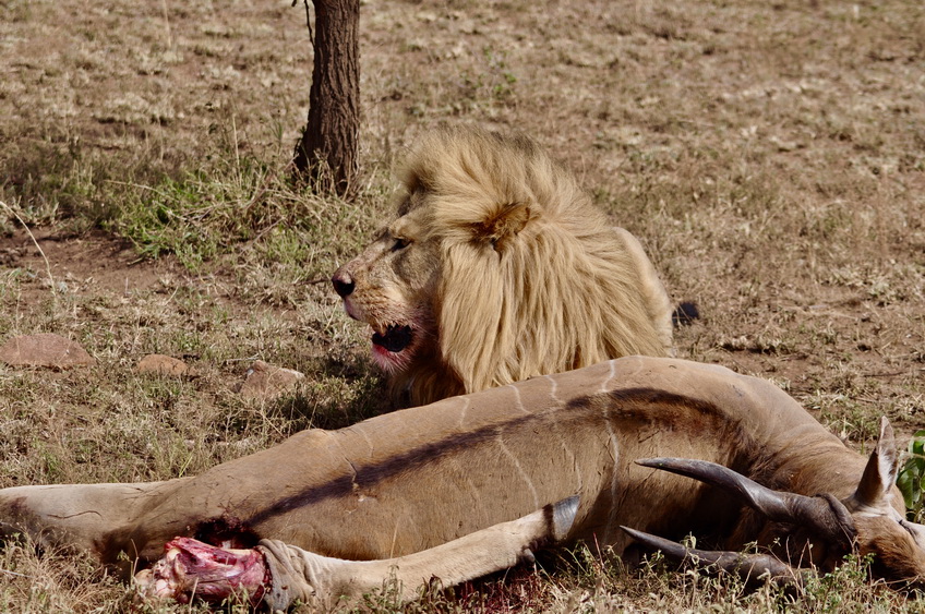 作者運氣不錯,在塞倫蓋蒂巡游時巧遇一頭雄獅守護在一頭被咬死的大羚羊旁。
