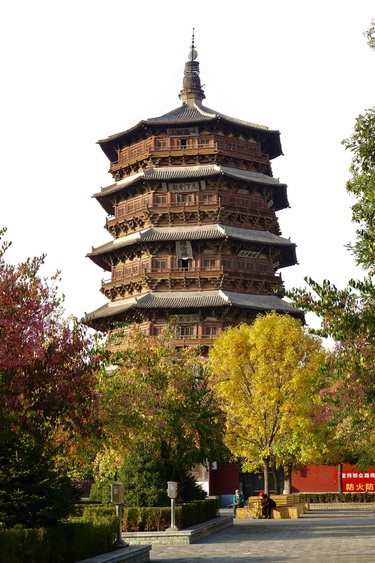 釋迦塔高67.31米,底層直徑30.27米,呈平面八角形。全塔用紅松木料3000立方米,重2600多噸,純木結(jié)構(gòu)、無釘無鉚。塔內(nèi)供奉著兩顆釋迦牟尼佛牙舍利。