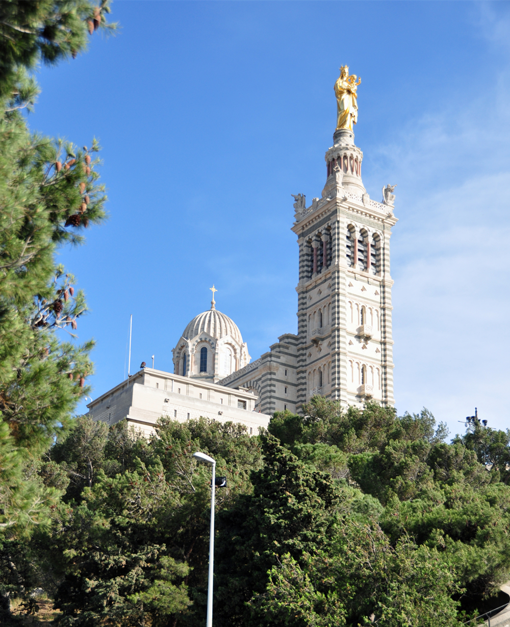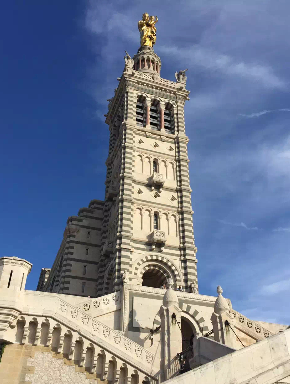 教堂主體建筑上方有一座金色的高達9.7米的鍍金圣母像,據(jù)說,幾乎在馬賽的任何角度都可看到這尊閃閃發(fā)光的圣母像,教堂也因此成為馬賽的標志。李仁奇 攝