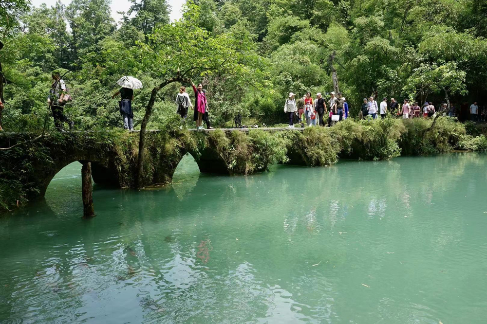 換個視角,河水油綠、橋墩被綠植包裹、游客走在橋上,畫面更美了。李仁奇 攝