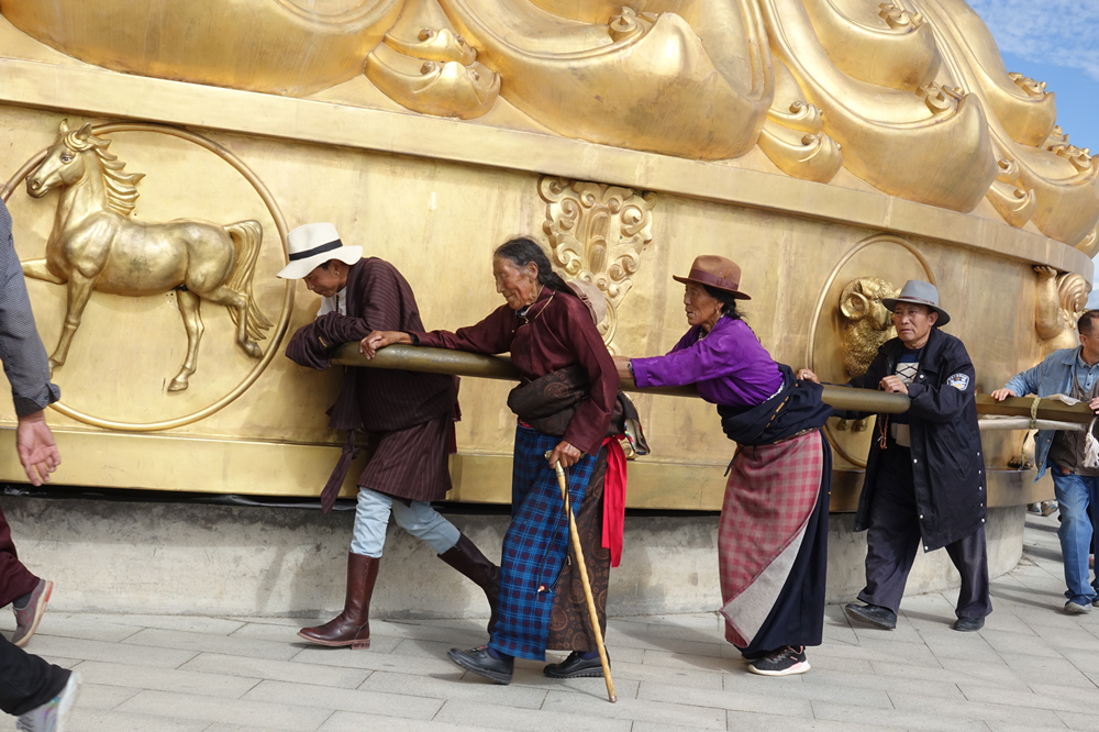 據(jù)傳,轉(zhuǎn)動經(jīng)輪一周,即等同于念誦《大藏經(jīng)》一遍。藏傳佛教認(rèn)為,“持頌真言越多,越表明對佛的虔誠,可得脫輪回之苦”。李仁奇 攝