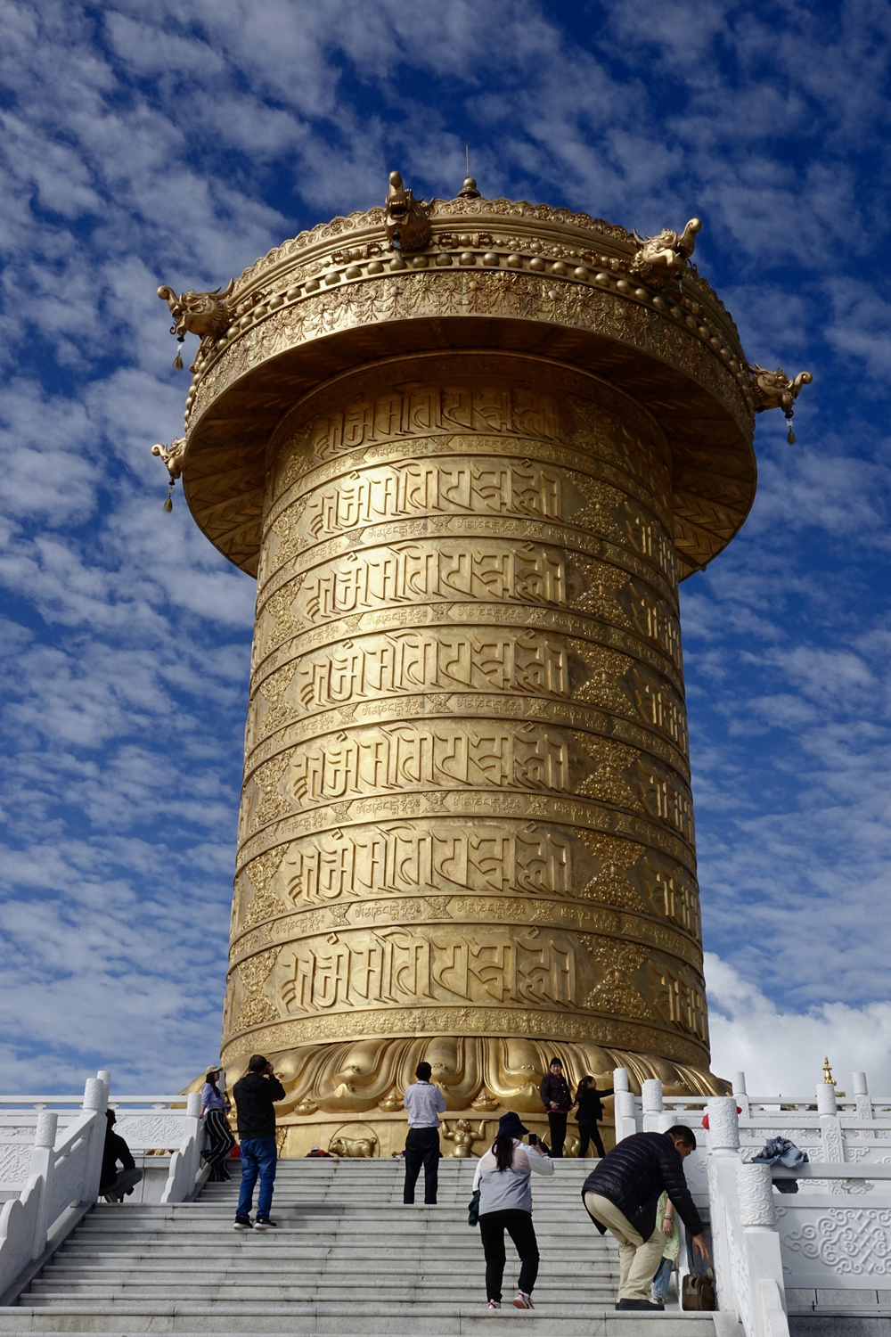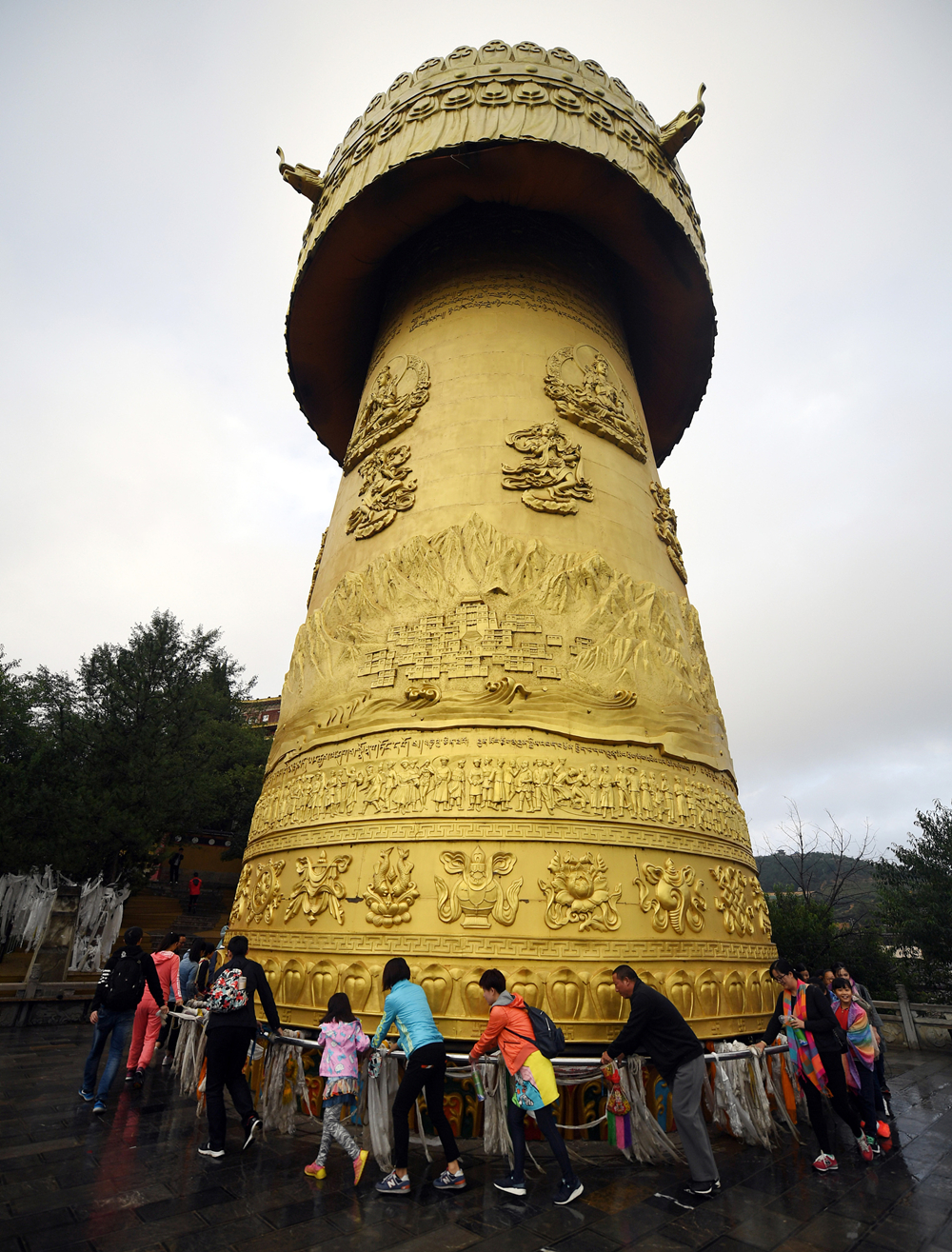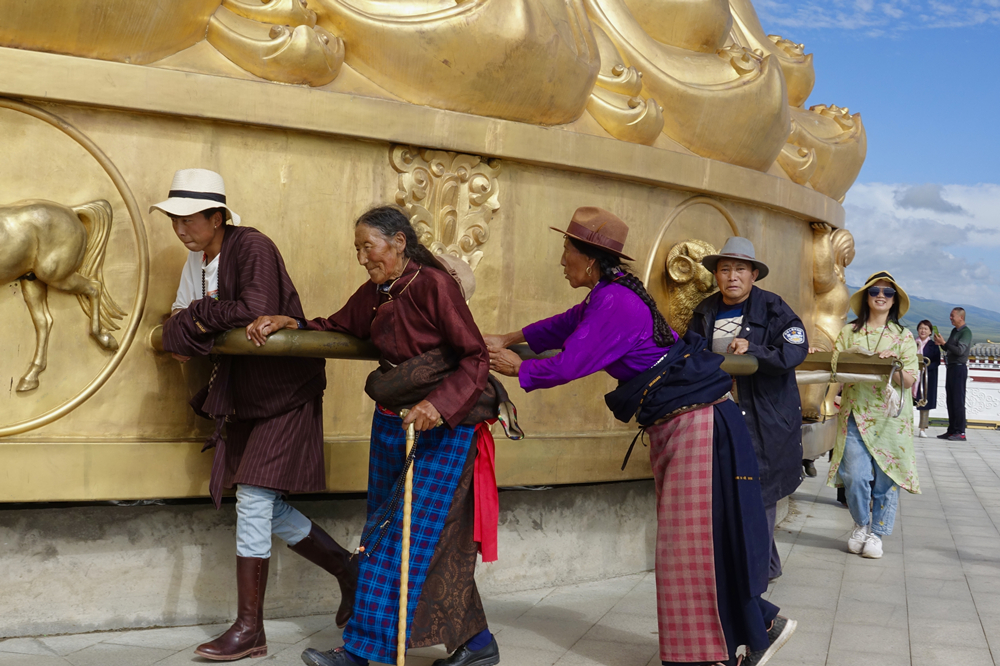 甘肅甘南藏族自治州瑪曲縣的寧瑪寺大藏經(jīng)轉(zhuǎn)經(jīng)筒矗立在金碧輝煌的寺院建筑群里,總投資4500萬元,歷經(jīng)四年,于2018年建成。筒體浮雕由尼泊爾工匠使用60公斤黃金手工鍛鑄鎏金而成。轉(zhuǎn)經(jīng)筒自身重量達(dá)320噸,內(nèi)裝大藏經(jīng)1008部共11萬冊。李仁奇 攝