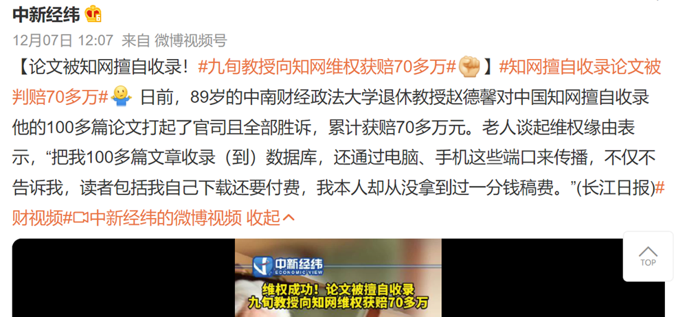 10.【法治事件】89歲退休法學(xué)教授趙德馨,從中國知網(wǎng)那里討回了自己160多篇稿件70多萬元元的收入,成為目前已知第一個(gè)向中國知網(wǎng)維權(quán)成功的勝訴案例。