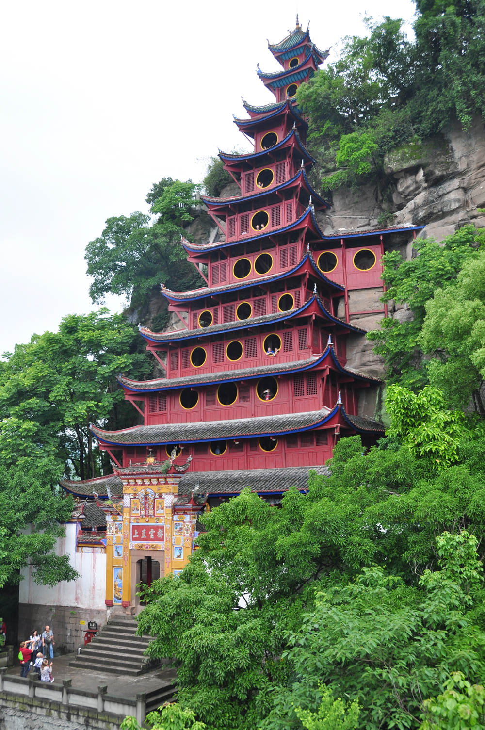 全寨共分兩部分,山下9層和山上3層錯落有致,從遠(yuǎn)處眺望12層樓重檐高聳,渾然一體,宏偉壯觀,共高56米,閣內(nèi)每層石壁上均有題詠。李仁奇 攝