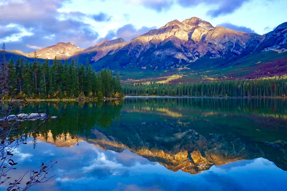 賈斯帕鎮(zhèn)北邊約7公里處的金字塔湖,海拔1179米,湖邊一座海拔2763米的山峰,呈比較對(duì)稱的三角形,山上的巖石含有黃鐵礦,呈現(xiàn)出被風(fēng)化了的粉色和橘色,像鍍了一層金,金字塔山和金字塔湖由此得名。李仁奇 攝