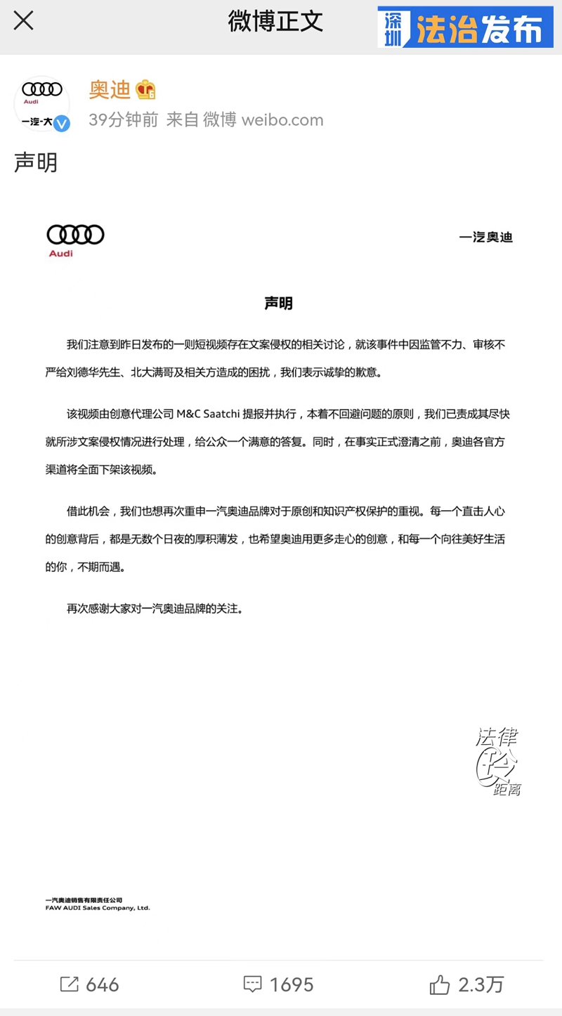 5月22日,奧迪官方全面下架了這部短片,并發(fā)布了道歉聲明。從奧迪公司的回應(yīng)得知,該短片由創(chuàng)意代理公司M&C Saatchi(上思廣告)提報(bào)并執(zhí)行,上思廣告也在微信公眾號(hào)發(fā)布聲明,承認(rèn)團(tuán)隊(duì)在未與版權(quán)方溝通的情況下,直接使用了抖音博主北大滿(mǎn)哥關(guān)于“小滿(mǎn)”的視頻中的文案內(nèi)容。