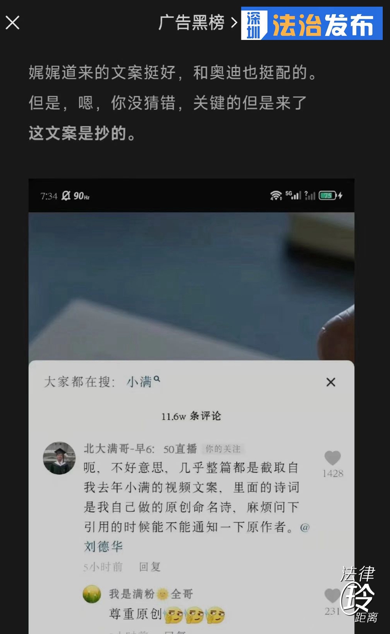 “北大滿(mǎn)哥”表示,奧迪小滿(mǎn)視頻文案幾乎整篇抄襲自己的作品。