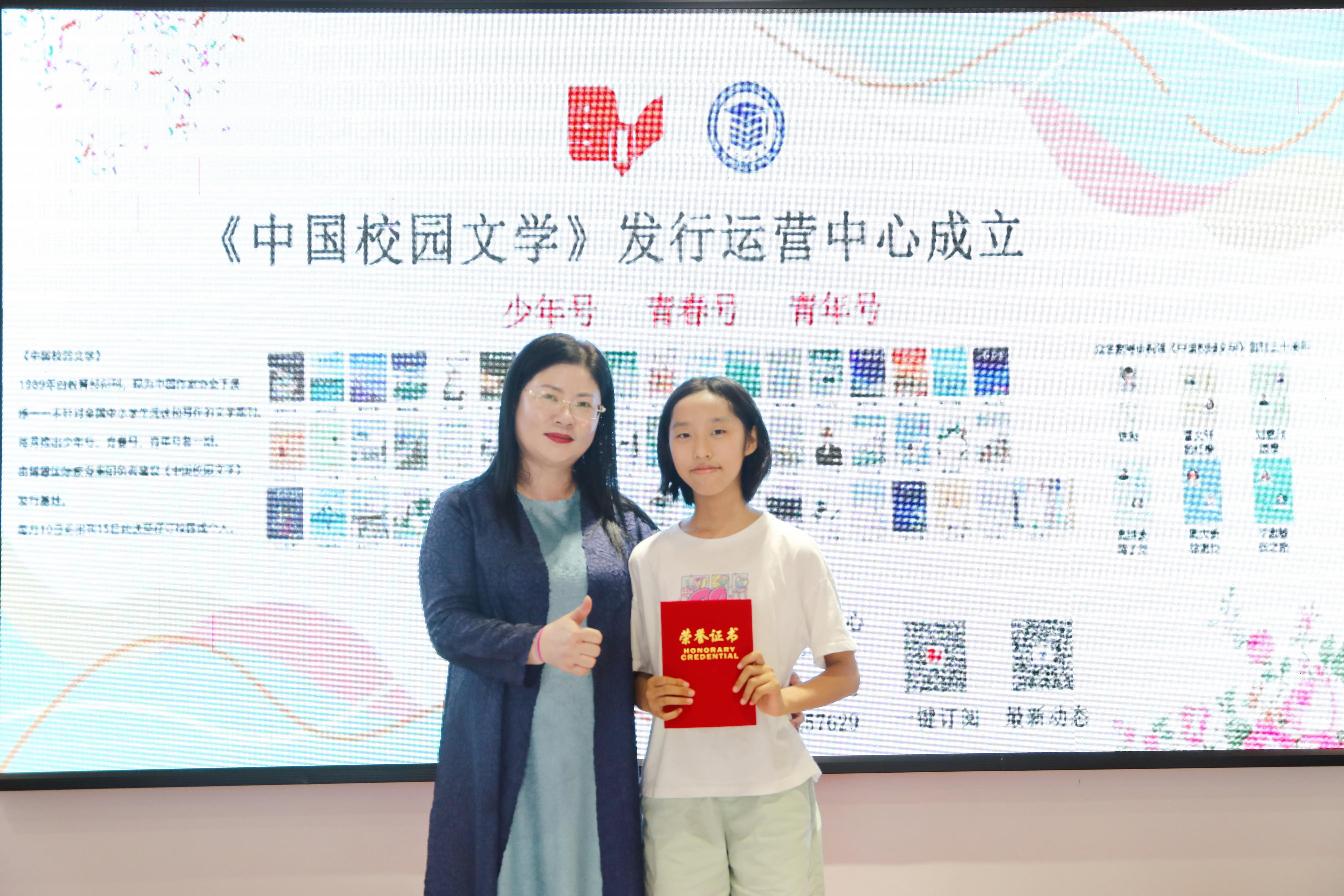 全國(guó)文學(xué)盛典聯(lián)合發(fā)起人、創(chuàng)始人肖硯寧為優(yōu)生代表頒獎(jiǎng)并合影