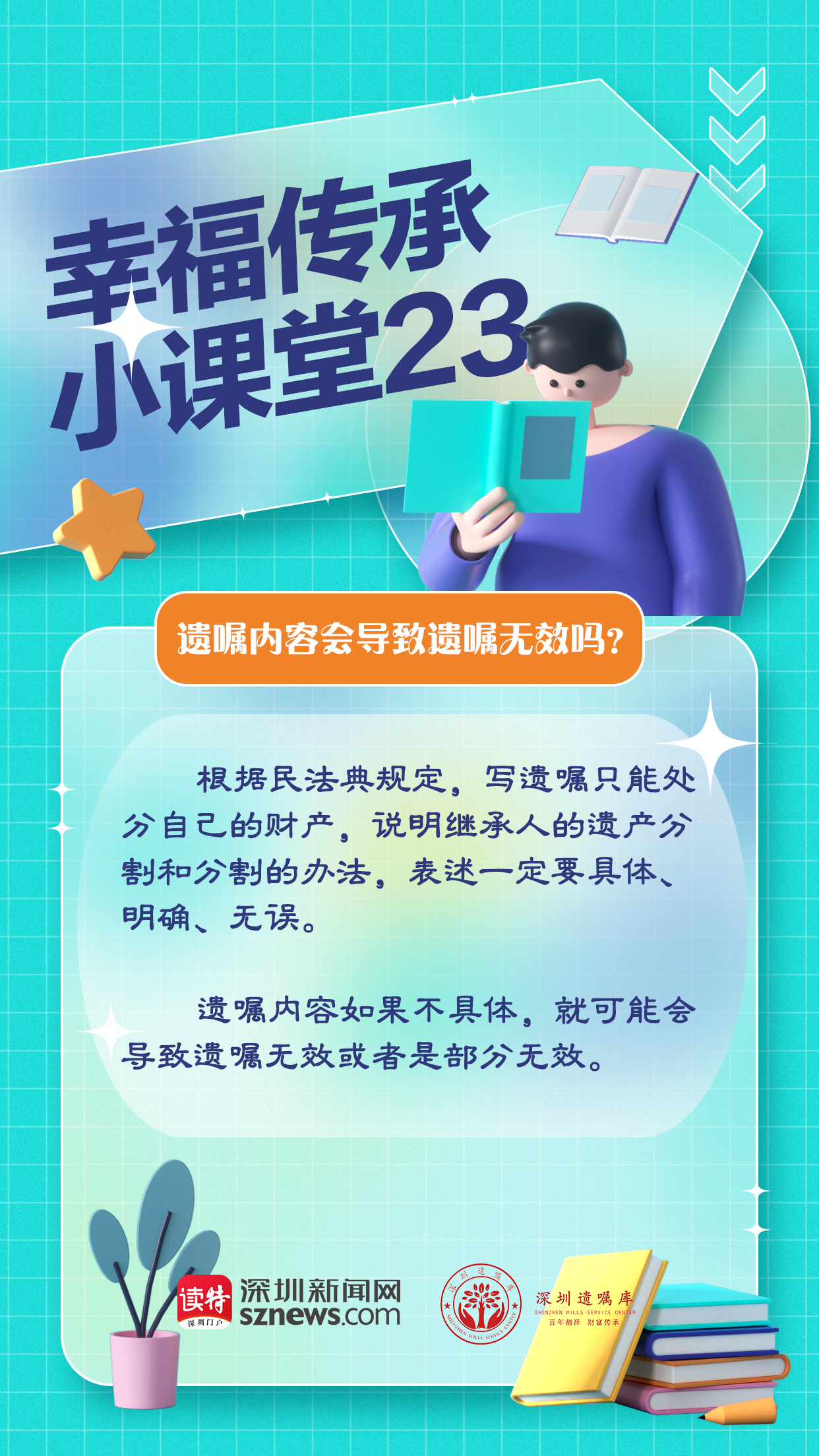 今天,由深圳遺囑庫(kù)與深圳新聞網(wǎng)聯(lián)合制作的幸福傳承小課堂第23期,我們就來說說,遺囑什么情況下可能無效。根據(jù)民法典規(guī)定,寫遺囑只能處分自己的財(cái)產(chǎn),說明繼承人的遺產(chǎn)分割和分割的辦法,表述一定要具體、明確、無誤。遺囑內(nèi)容如果不具體,就可能會(huì)導(dǎo)致遺囑無效或者是部分無效。因此,李大爺不能將財(cái)產(chǎn)的全部都給到后老伴,法院也判定了這份遺囑是部分無效的。