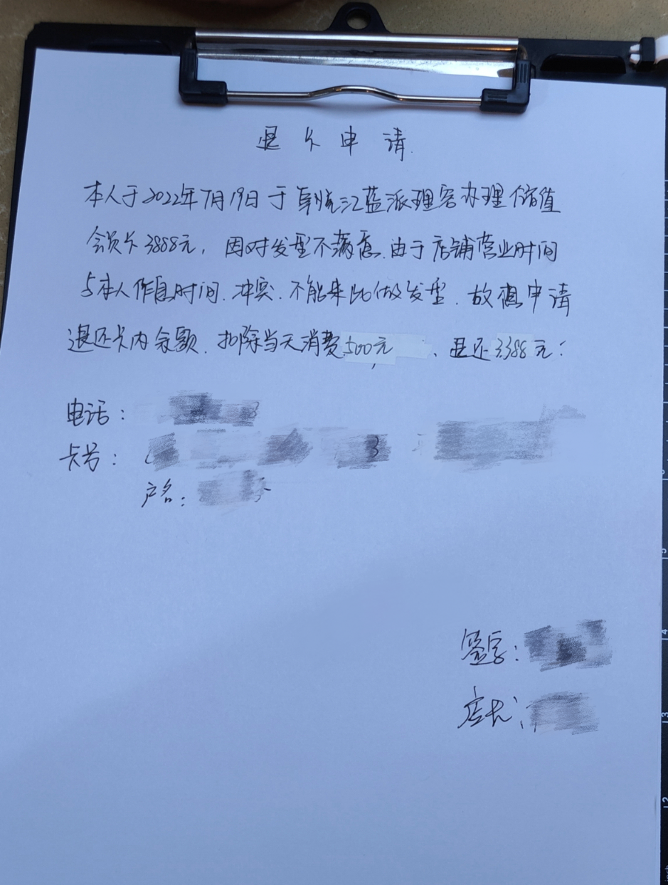 本人于2022年7月19日在該商家處花費(fèi)3888元充值會員卡,后因?qū)Πl(fā)型不滿意及店鋪營業(yè)時間與本人作息時間沖突,故申請退還卡內(nèi)余額。商家于2023年4月25日同意在5個工作日內(nèi)退款,但一直拖延,至今仍未退款。