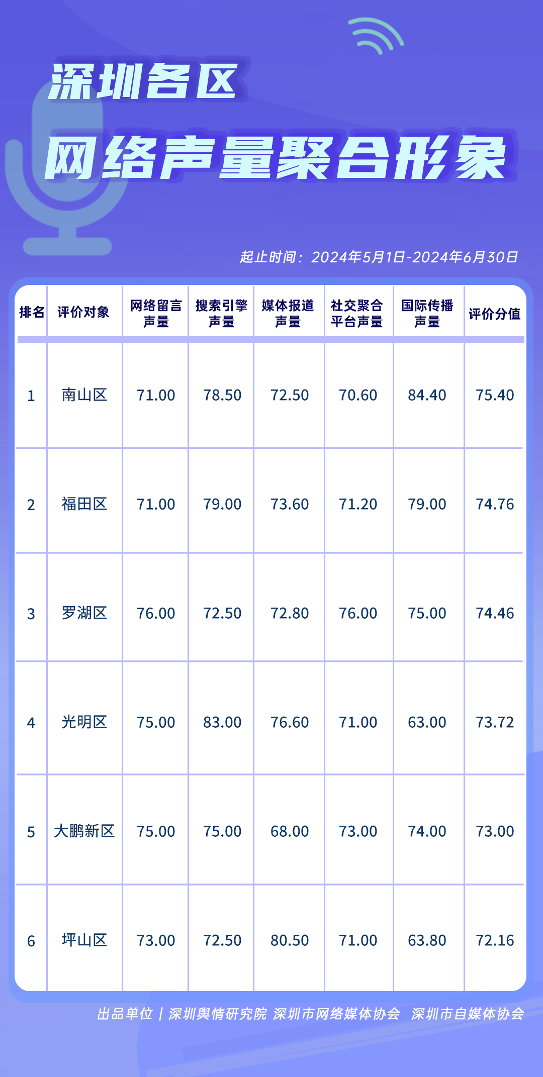 5-6月,大鵬新區(qū)登上《深圳各區(qū)社會(huì)生活網(wǎng)絡(luò)形象榜》榜首,其消費(fèi)、居住、教育、環(huán)境形象得分均在80分以上,綜合評(píng)價(jià)分值領(lǐng)先,這不僅反映了大鵬新區(qū)在網(wǎng)絡(luò)形象治理方面的全面投入,也顯示出其在提升居民生活質(zhì)量、營(yíng)造和諧宜居環(huán)境方面取得的顯著成效。緊隨其后的是坪山區(qū),以77.92分的評(píng)價(jià)分值位列第二,尤其在居住、教育形象兩方面獲得較高評(píng)分,凸顯其在社會(huì)生活網(wǎng)絡(luò)形象塑造上的卓越表現(xiàn)。位于榜單第三至第六名的深汕特別合作區(qū)、福田區(qū)、鹽田區(qū)、寶安區(qū)綜合評(píng)價(jià)分值均在73分以上,充分證明了這些區(qū)域在構(gòu)建積極的社會(huì)生活網(wǎng)絡(luò)形象上所做的不懈努力和取得的成果。上榜區(qū)域的優(yōu)異表現(xiàn)不僅是對(duì)其綜合實(shí)力的認(rèn)可,也是它們持續(xù)提升居民生活質(zhì)量、營(yíng)造和諧宜居環(huán)境的有力證明。