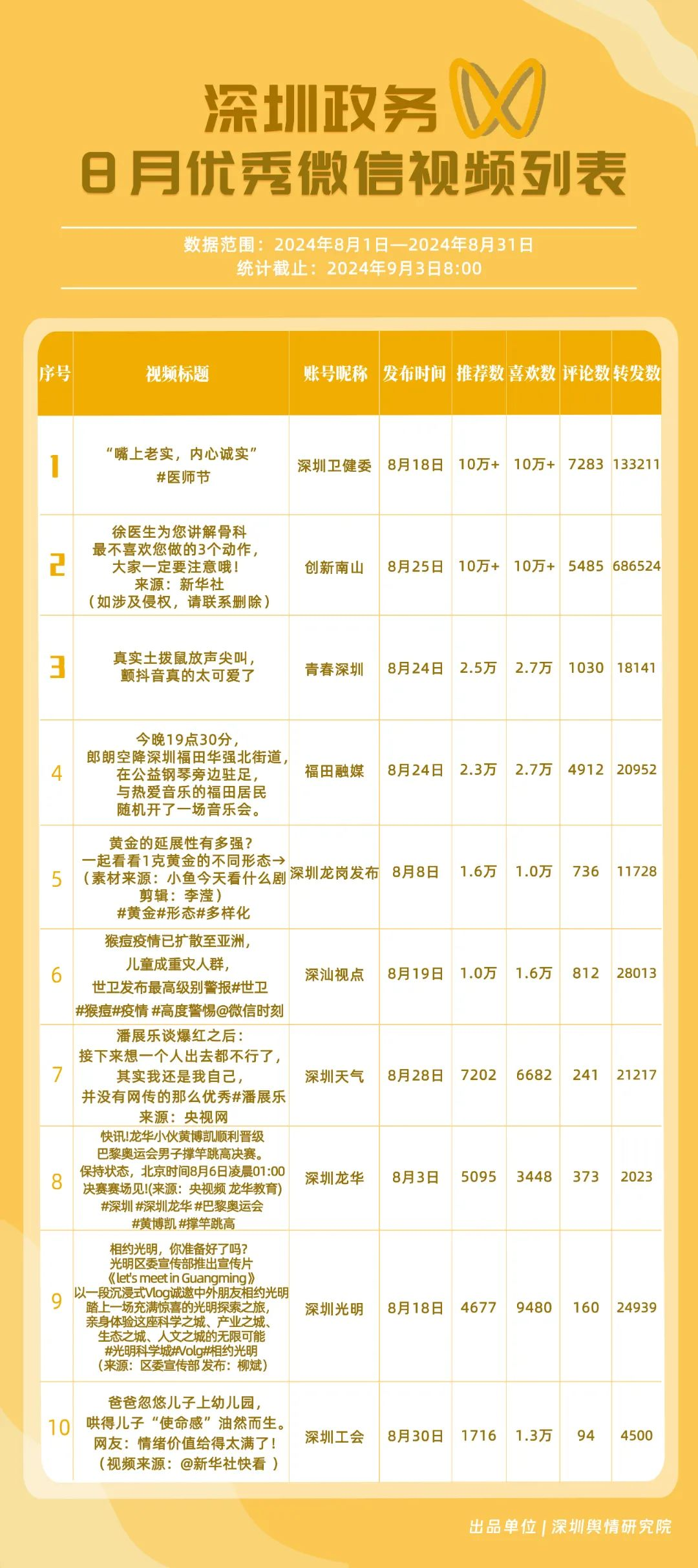 8月,獲“深圳優(yōu)秀政務(wù)微信視頻號(hào)”稱(chēng)號(hào)的分別是“創(chuàng)新南山”“深圳衛(wèi)健委”“福田融媒”“深汕視點(diǎn)”“深圳龍崗發(fā)布”“青春深圳”“深圳天氣”“深圳光明”“深圳工會(huì)”和“深圳公安”。微信視頻號(hào)方面,多賬號(hào)以原創(chuàng)內(nèi)容吸引了大量關(guān)注,如“郎朗空降深圳華強(qiáng)北”“深圳坪山長(zhǎng)守戲劇谷”等,展示了深圳的文化魅力和城市活力,也有賬號(hào)轉(zhuǎn)載網(wǎng)絡(luò)熱門(mén)視頻,以其實(shí)用性、趣味性獲得了網(wǎng)民的推薦和點(diǎn)贊。