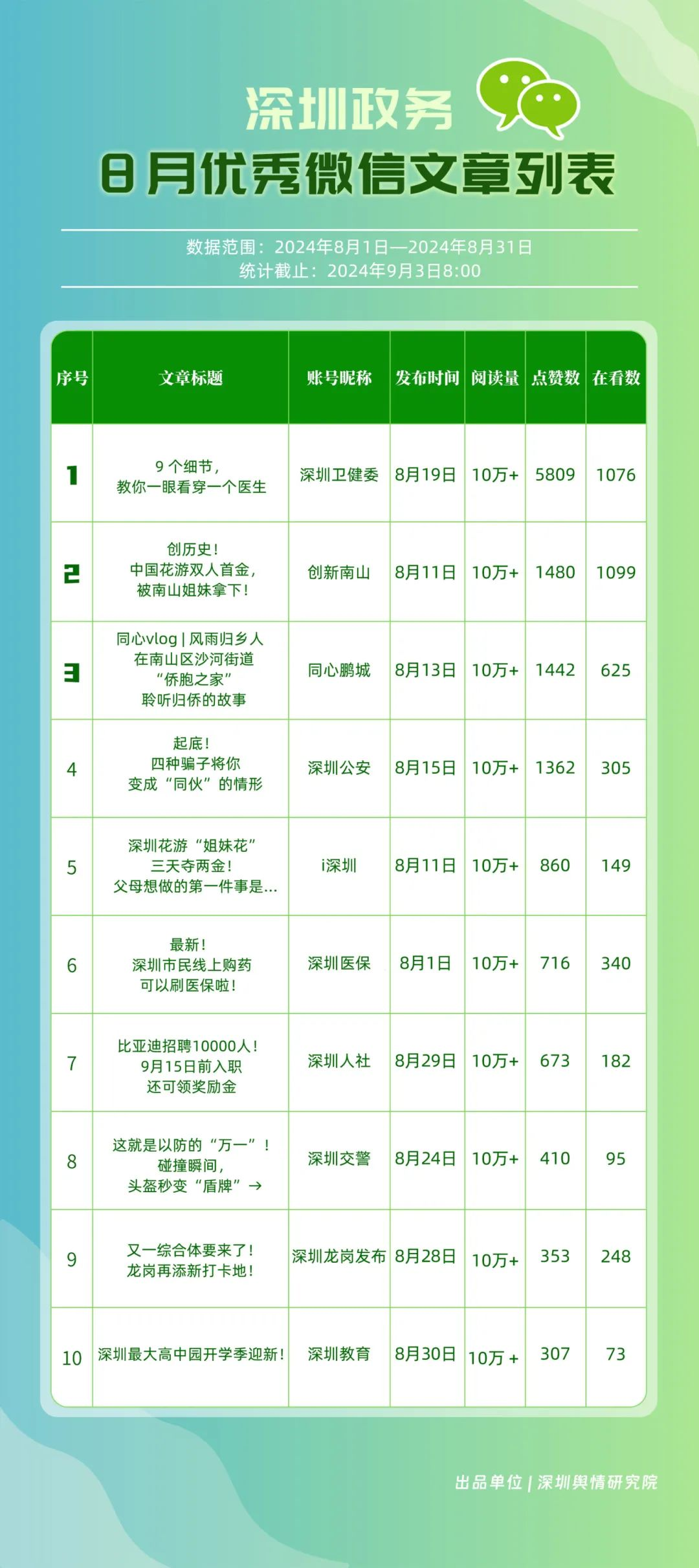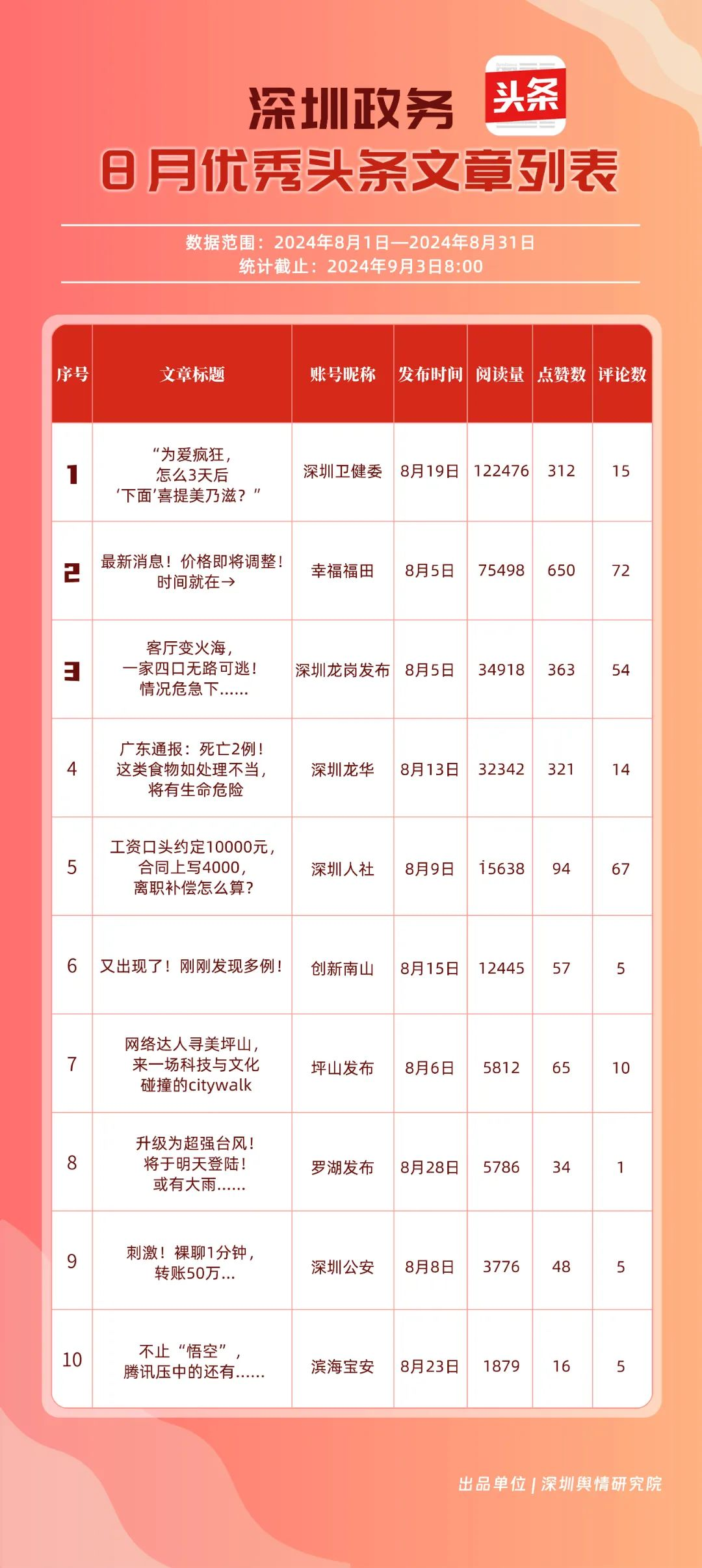 8月,“幸福福田”“深圳龍崗發(fā)布”“深圳衛(wèi)健委”“深圳龍華”“創(chuàng)新南山”“深圳人社”“深圳光明”“羅湖發(fā)布”“濱海寶安”和“坪山發(fā)布”共10個(gè)政務(wù)頭條號(hào)入選榜單。相關(guān)賬號(hào)的文章《“為愛(ài)瘋狂,怎么3天后‘下面’喜提美乃滋?”》《最新消息!價(jià)格即將調(diào)整!時(shí)間就在→》等貼近民生,傳遞實(shí)用信息,收獲了較高的閱讀量和點(diǎn)贊數(shù)。