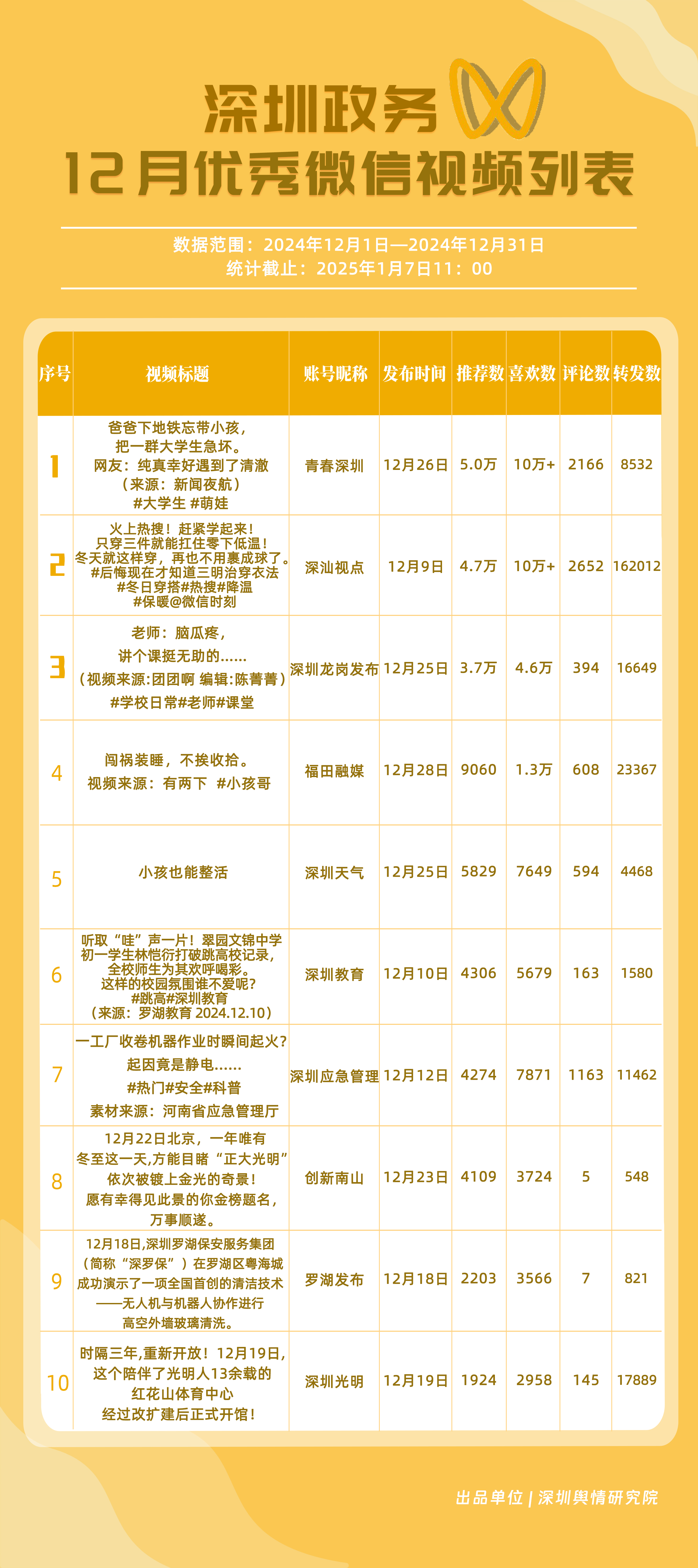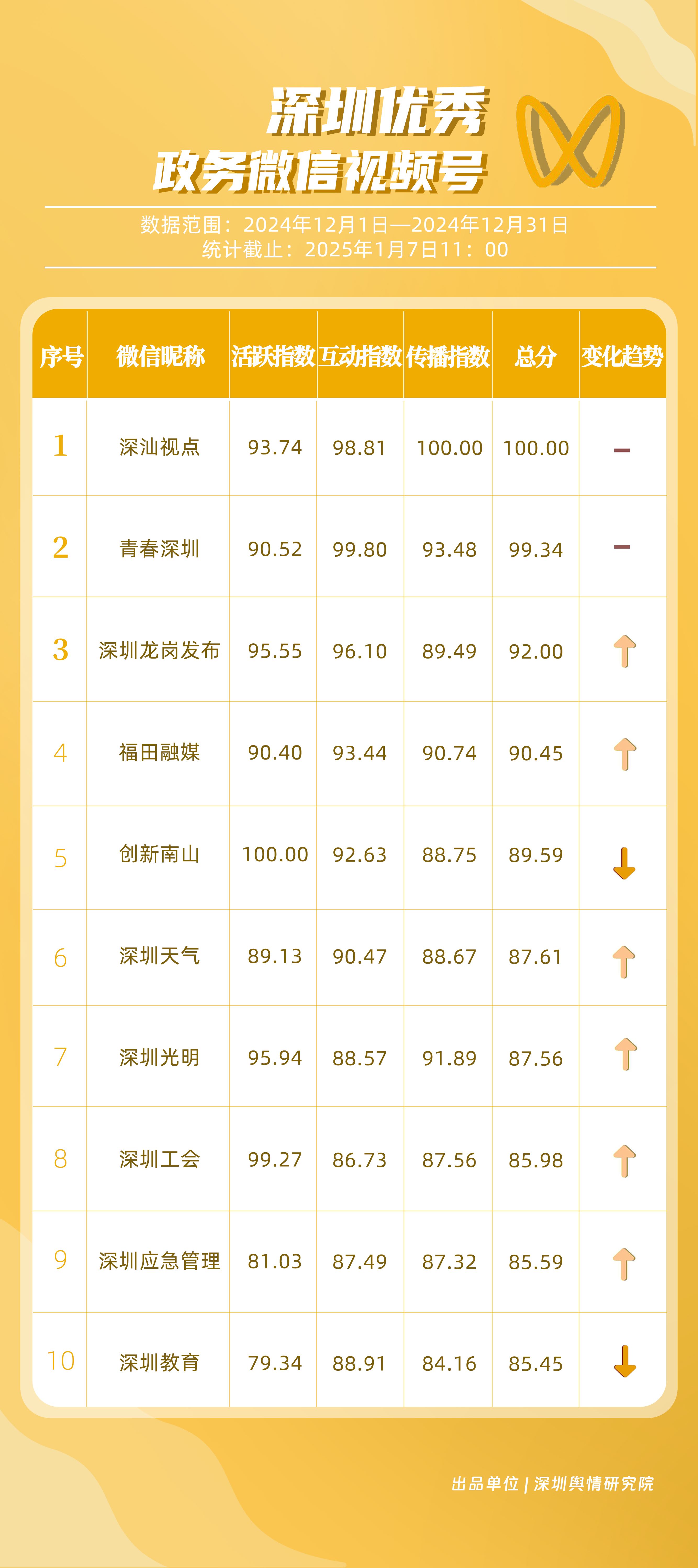 12月,獲“深圳優(yōu)秀政務(wù)微信視頻號”稱號的分別是“深汕視點(diǎn)”“青春深圳”“深圳龍崗發(fā)布”“福田融媒”“創(chuàng)新南山”“深圳天氣”“深圳光明”“深圳工會(huì)”“深圳應(yīng)急管理”“深圳教育”。其中,“深汕視點(diǎn)”“青春深圳”在互動(dòng)方面表現(xiàn)突出,占據(jù)榜單第一、第二位置。“深圳龍崗發(fā)布”活躍、互動(dòng)指數(shù)位于各政務(wù)視頻號前列,排名有所提升?!案L锶诿健比笾笜?biāo)得分均在90分以上,位于榜單第四名,充分展現(xiàn)各政務(wù)微信視頻號在信息更新、用戶互動(dòng)以及傳播范圍等方面的卓越能力和持續(xù)進(jìn)步。