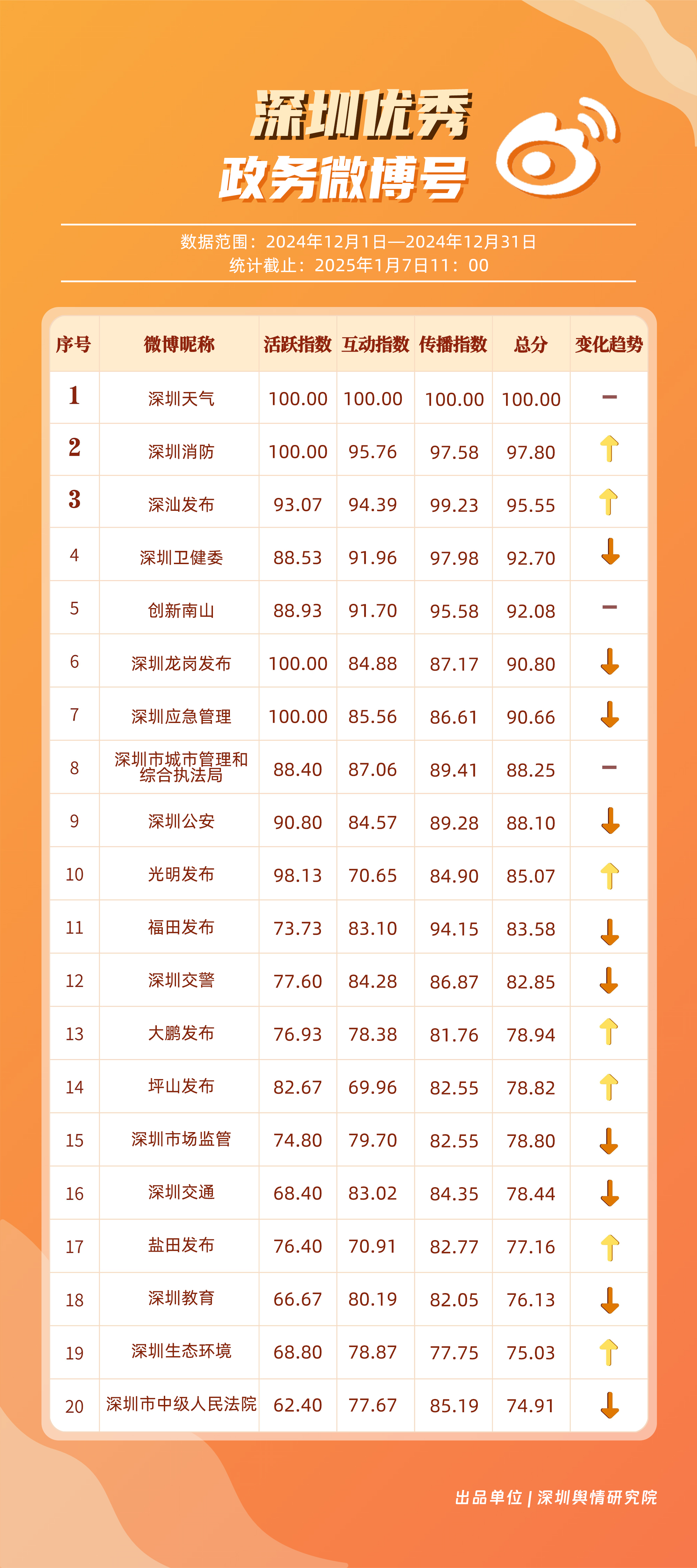 12月,“深圳天氣”“深圳消防”“深汕發(fā)布”“深圳衛(wèi)健委”“創(chuàng)新南山”“深圳龍崗發(fā)布”“深圳應(yīng)急管理”“深圳市城市管理和綜合執(zhí)法局”“深圳公安”“光明發(fā)布”等20個(gè)賬號入選“優(yōu)秀政務(wù)微博號”?!吧钲谔鞖狻鲍@得滿分,“深圳消防”“深汕發(fā)布”賬號總分均超95分,位于榜單前三名。同時(shí),“深圳衛(wèi)健委”“創(chuàng)新南山”“深圳龍崗發(fā)布”及“深圳應(yīng)急管理”等賬號憑借對熱點(diǎn)的敏銳捕捉與信息的及時(shí)發(fā)布,總分在90分以上,體現(xiàn)出各自在提升公眾信息獲取質(zhì)量方面的不懈努力,彰顯了政務(wù)微博賬號在政民連接、信息共享等方面的巨大價(jià)值。