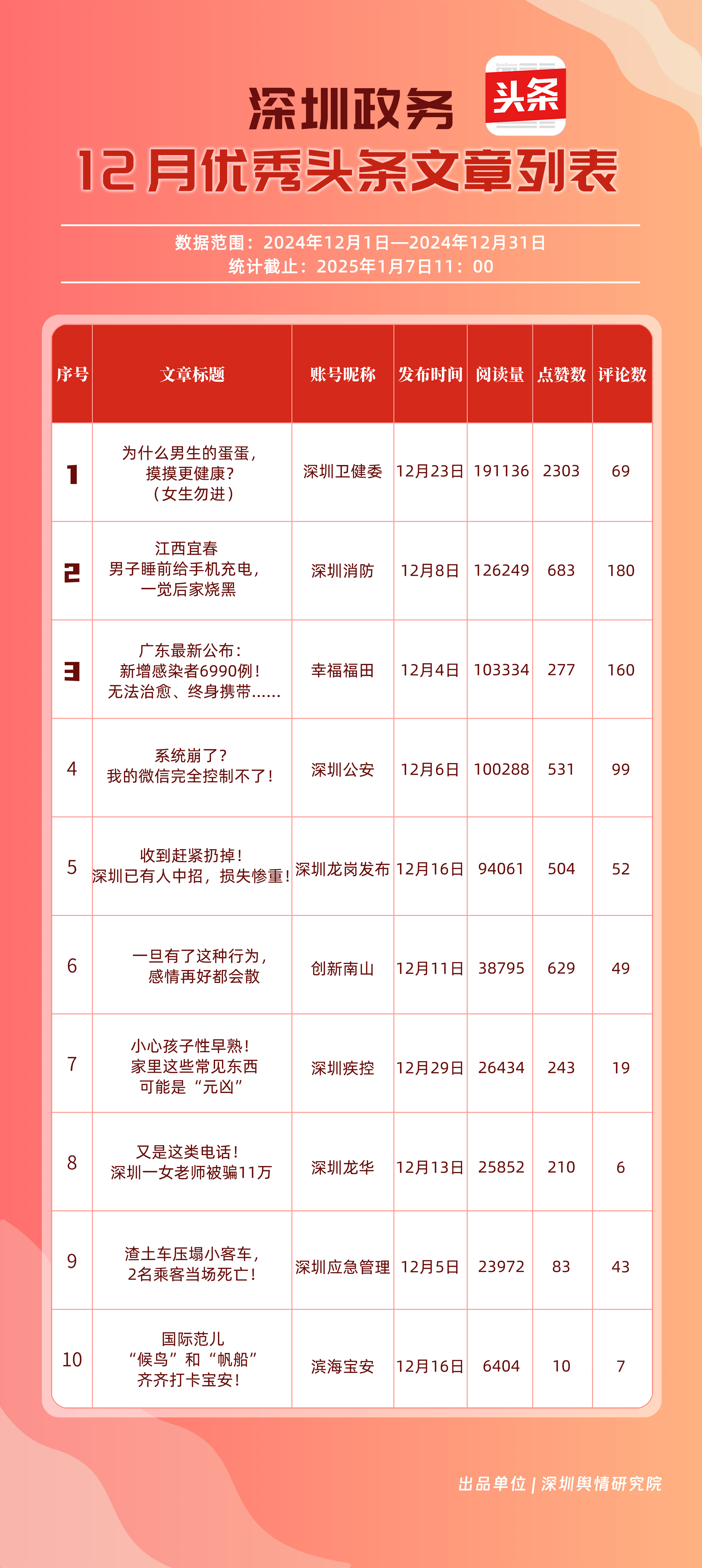 12月,市衛(wèi)生健康委、龍崗區(qū)、福田區(qū)、南山區(qū)、市氣象局、深汕特別合作區(qū)、光明區(qū)、市消防救援支隊(duì)、龍華區(qū)、市應(yīng)急管理局榮登“深圳優(yōu)秀政務(wù)新媒體矩陣”榜單。12月,市衛(wèi)生健康委持續(xù)發(fā)力抖音等平臺,鞏固榜首地位,展現(xiàn)了政務(wù)宣傳賬號的蓬勃活力與創(chuàng)新能力,贏得了廣泛關(guān)注。龍崗區(qū)新媒體矩陣則在微信公眾號、抖音兩大平臺上取得了亮眼成績。福田區(qū)新媒體矩陣通過精心策劃與運(yùn)營微信公眾號平臺,成功吸引了大量忠實(shí)讀者,最終在《深圳優(yōu)秀政務(wù)新媒體矩陣》榜單中榮獲第三名。同時(shí),南山區(qū)、市氣象局、深汕特別合作區(qū)等新媒體矩陣在也在各自領(lǐng)域內(nèi)大放異彩,在榜單中名列前茅。